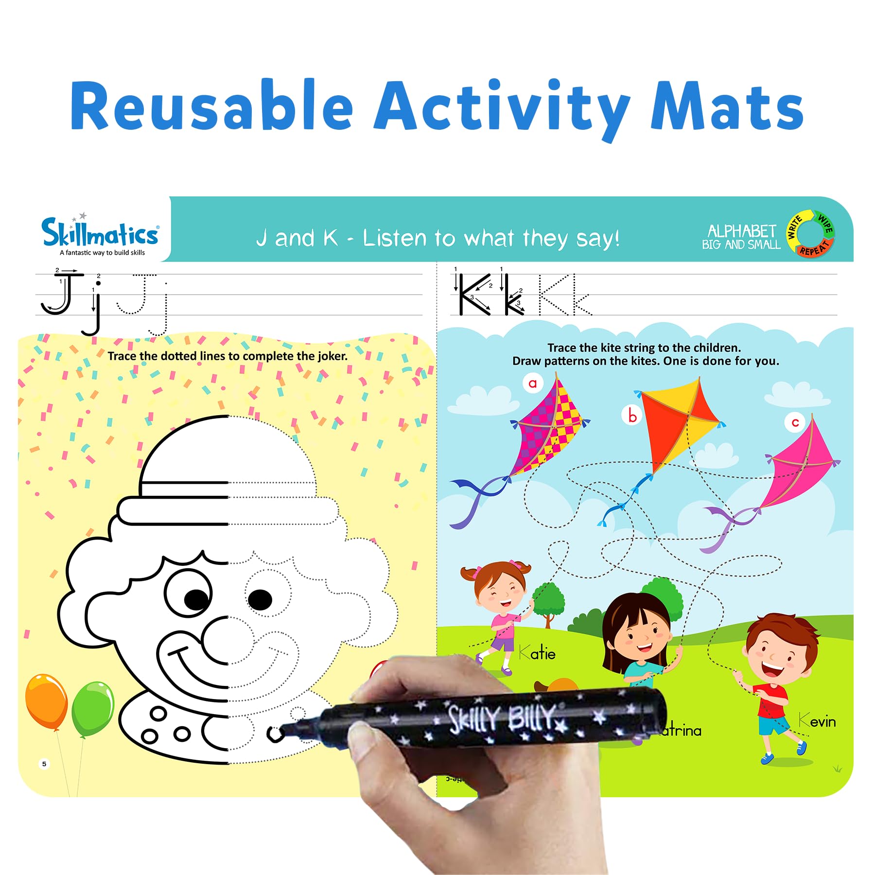 - Q: How do the write and wipe activity mats work? A: The write and wipe activity mats allow children to practice writing letters repeatedly. They can use the included dry erase markers to write on the mats and easily erase their work with the duster cloth, encouraging endless practice.