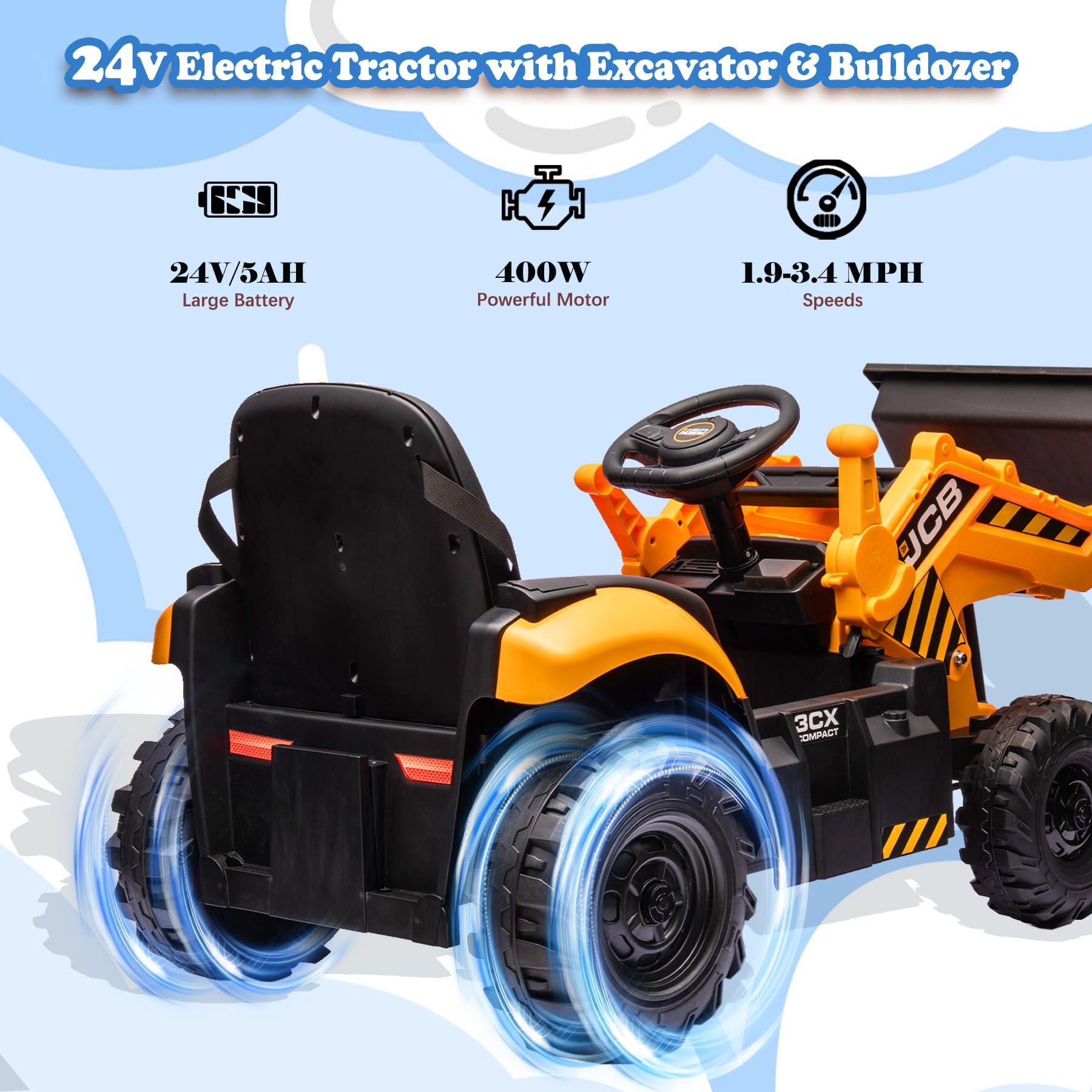 - Premium Performance: Powered by a robust 400W motor and a 24V 5AH rechargeable battery, the ride-on excavator can reach speeds of 1.9-3.4 MPH. It provides a thrilling ride experience lasting between 60-120 minutes on a single charge.