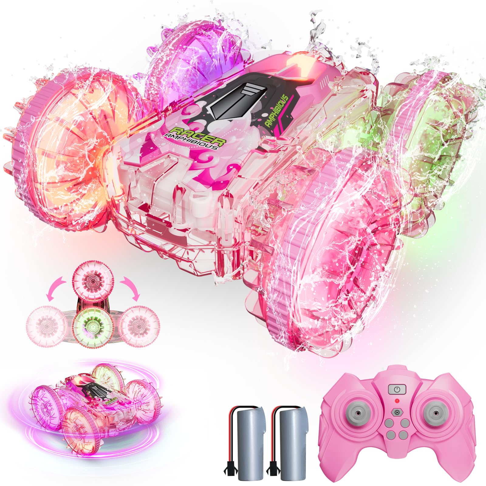 View compareBFUNTOYS Amphibious Remote Control Car for Water or Land Play, RC Car for Kids Girls with LED Lights 4WD Stunt Car Pink Pool Toy