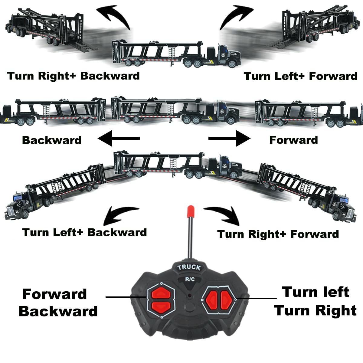 • Q: What features make this remote control truck easy to operate for beginners? A: The CALEST Remote Control Truck features a 4-channel remote control that allows for easy movement in all directions (forward, backward, left, right) and includes headlights and a cab cold light, making it simple for children to operate.