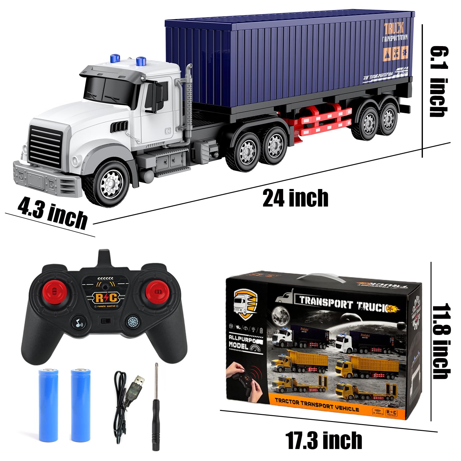 Remote Control Semi Truck with Trailer -24 Inch Semi Truck Toy for Kids,1:24 Container Truck with LED Lights & Music, Great Gift For Boys Girls