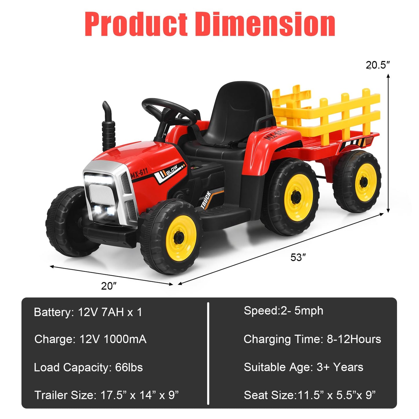 Description: This ride on tractor with trailer helps your sweetie transport toys, snacks, and leaves, exercising your child’s courage and operation coordination! Meanwhile, it comes with a 2.4G remote control that allows parents to control the speed and direction of the car to free parents from concern about their kids. Kids can move the powered ride on toys forward or backward at a high or low speed with the 3-gear shift using a corresponding switch. Built-in music, USB port, and wireless technology would let kids drive in a relaxed atmosphere. These tractor toys for boys and girls also strike the perfect balance between safety and comfortableness, reflected in the wide seat with a safety belt, parent remote, soft start, stop, etc. Features: 2 optional modes, parental remote control mode, and battery operated mode Speed and direction can be controlled by 2.4G remote control High/low speeds in manual mode, 3 variable speeds in remote mode Rechargeable design, 12V powerful motor for longer driving time Bright LED lights light up the dark surroundings and add more driving fun Wide seat with safety belt combines higher comfortableness and safety With a detachable trailer for delivering toys, grass, straw, etc Wear-resistant wheels for various roads such as the wood floor, asphalt roads, brick roads, etc Come with CPSIA and ASTM certifications for safe use Has a gear-shift handle that corresponds to two forward gears and one reverse gear Specification: Color: Black/ Dark Green/ Green/ Red/ Yellow Material: PP,Metal Size with Trailer: 53” x 20” x 20.5” (L x W x H) Size without Trailer: 33.5” x 19.5” x 20.5” (L x W x H) Net Weight: 29 lbs Weight Capacity: 66 lbs Battery: 12V 7AH x 1 Charger: 12V 700MA~1000MA Speed: 3 – 8 km/h Suitable Age: 3+ Years Charge Time: 8-12 hours Package Includes: 1 x Ride On Tractor 1 x Instruction