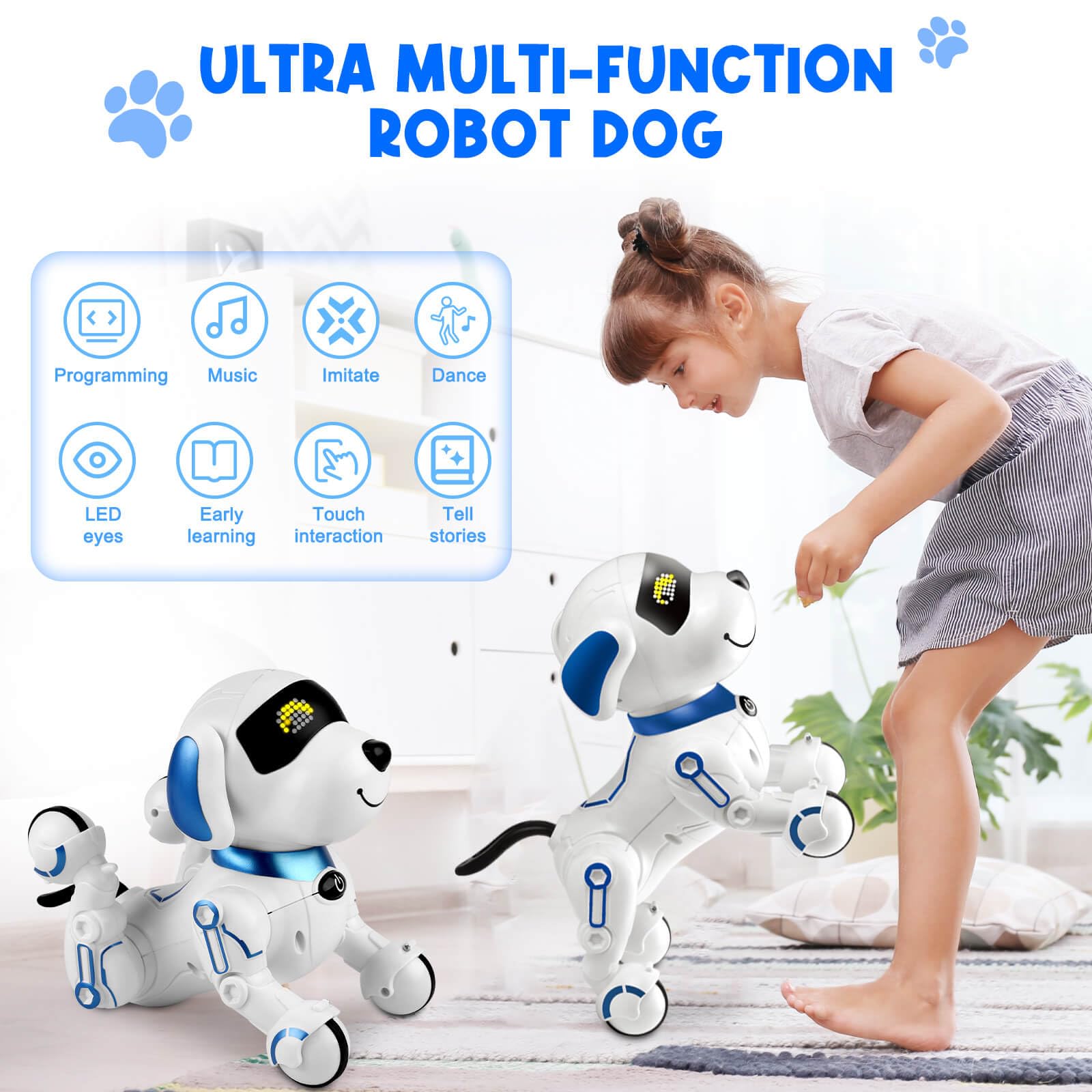 • Q: How does the programming feature work in the Dolanus Robot Dog? A: The robot dog includes a programming key that allows children to create custom routines by pressing buttons. The dog will then perform the programmed actions step by step, encouraging logical thinking and creativity.