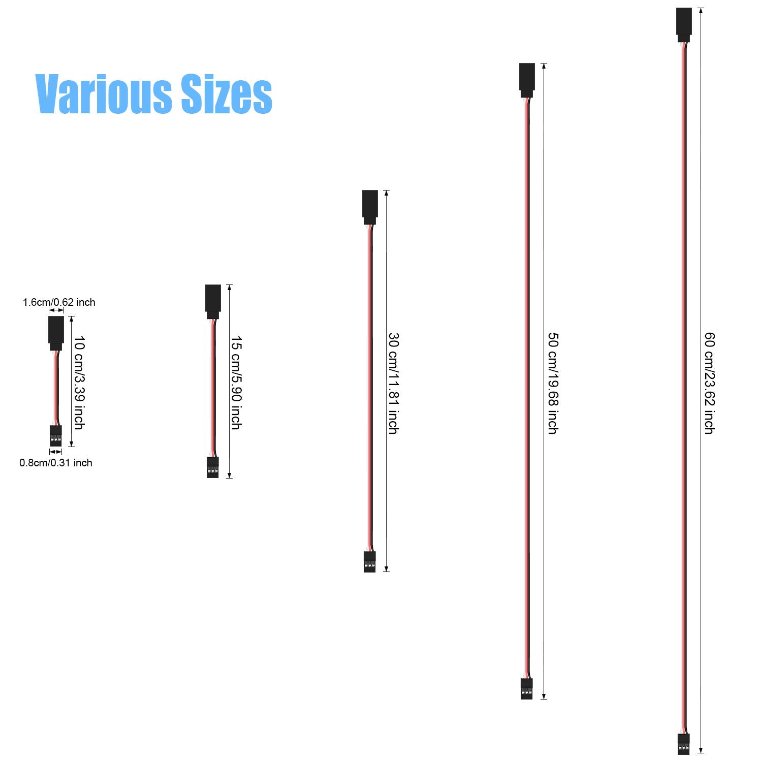 ?Specifications:? - Quantity: 30 PCS - Wire Type: 22AWG - Connector Color: black - Material: plastic + copper - Cable Color: red, white and black - Connectors: 3-pin male to female servo cable - Wire Length: 10 cm/ 3.95 inch, 15 cm/ 5.9 inch, 30 cm/ 11.8 inch, 50 cm/ 19.7 inch and 60 cm/ 23.6 inch ?Features:? 1, These servo cable made with high quality 22 AWG wire, the contact material is pure copper, ensuring a firm connection every time. 2, These servo extension lead wires featured with 3 pins, and each has an angle, in case you will install incorrectly, convenient use design. 3, These servo extension lead wires can be applied for Futaba and JR Servo, remote control car, plane, helicopter and drones servo connection or receiver connection. ?Package Included:? 10 cm Long servo cable connector-----------------6 Pieces 15 cm Long servo cable connector-----------------6 Pieces 30 cm Long servo cable connector-----------------6 Pieces 50 cm Long servo cable connector-----------------6 Pieces 60 cm Long servo cable connector-----------------6 Pieces ?Total: 30 Pieces 3-Pin Extension Cable Cord Male to Female Lead Wire Connectors?