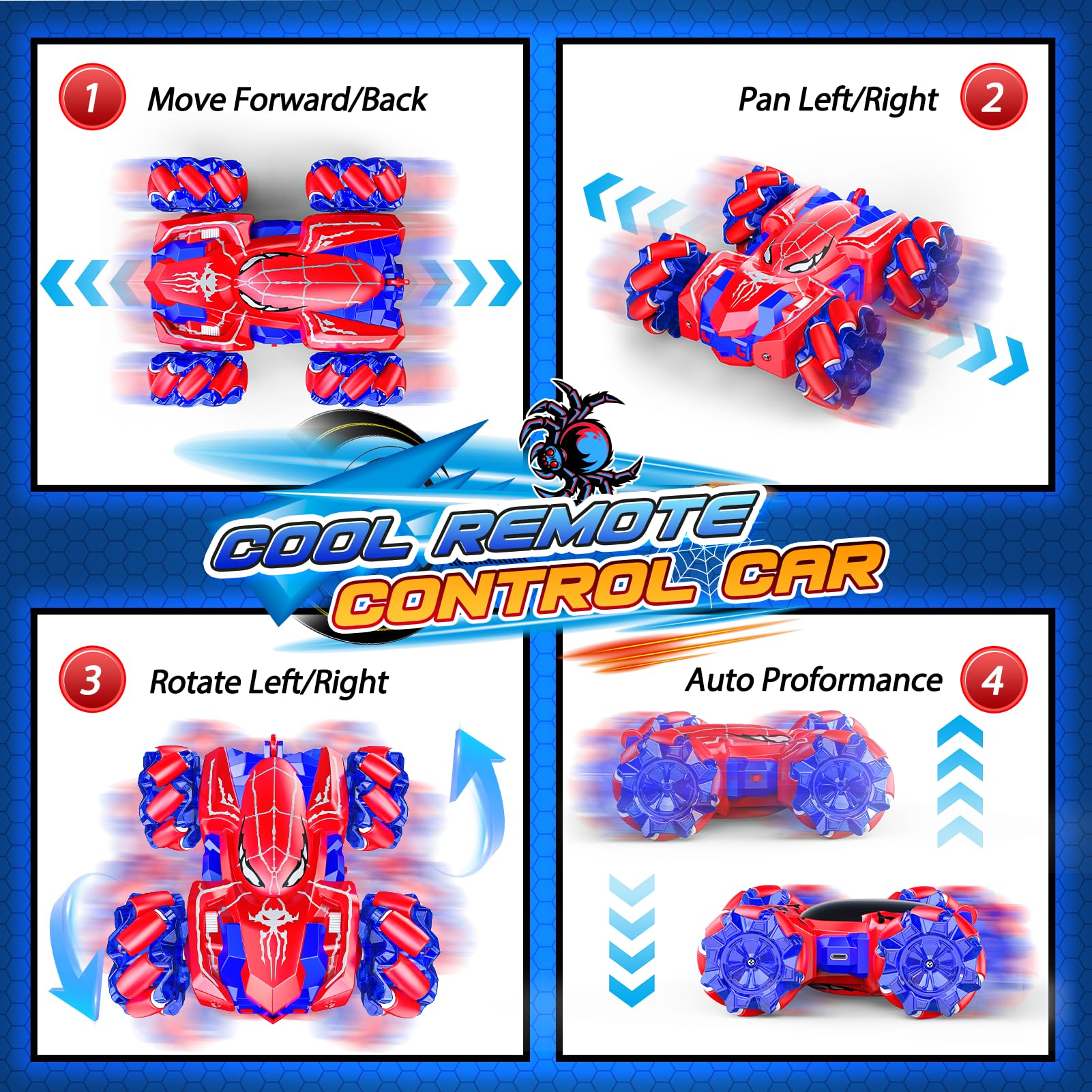 - Q: How does the 360-degree rotation feature work on this RC car? A: This RC car can drive forward, backward, left, and right while also being able to drift and rotate 360 degrees in place, allowing kids to perform impressive stunts and navigate obstacles easily.