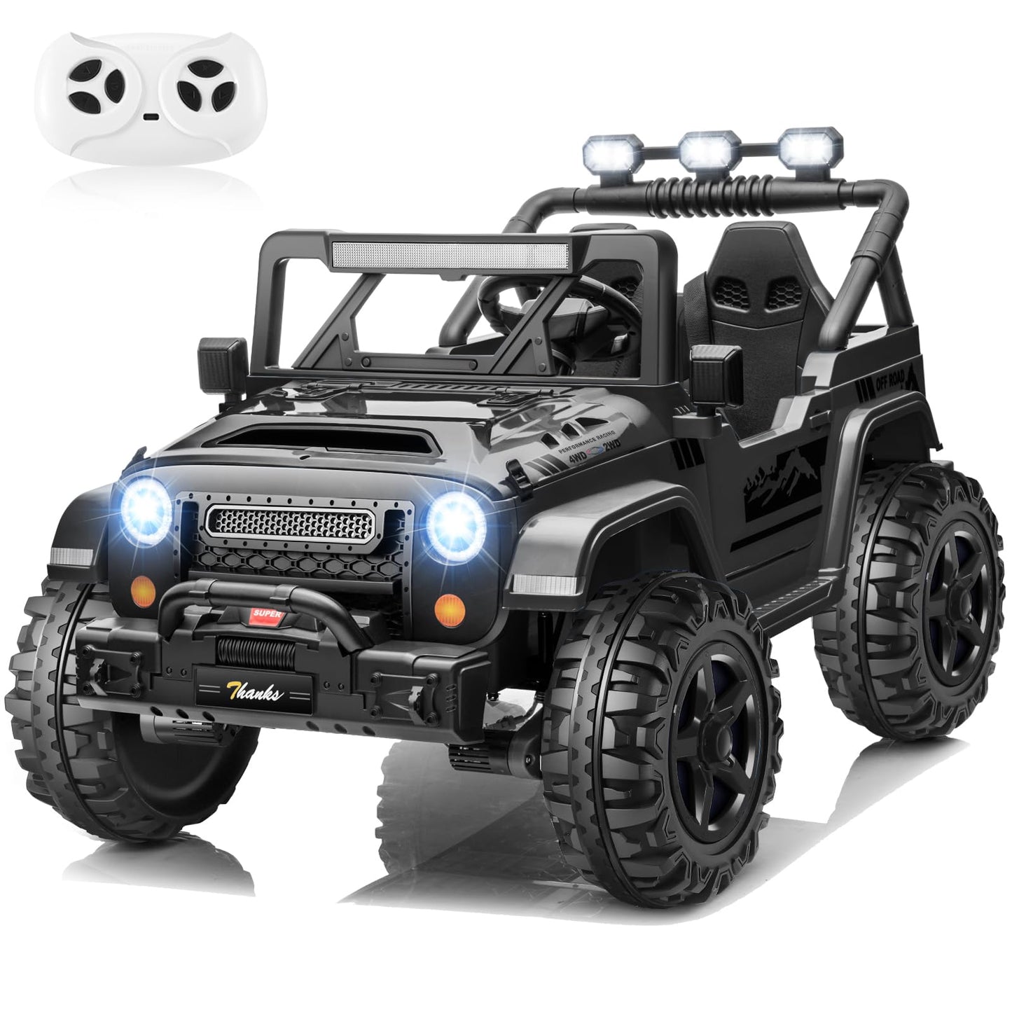 Hikole 24v 2 seater ride on cars features powerful 4*200W motors with switchable 2WD/4WD modes, ensuring safe and exciting adventures. Equipped with music playback, wireless Bluetooth, and captivating LED lights, its designed to keep kids entertained. With an 800W motor, it easily conquers various terrains. The 7AH battery supports remote control for emergency braking, providing extra safety. The 20-inch wide seat ensures comfortable rides for two children.