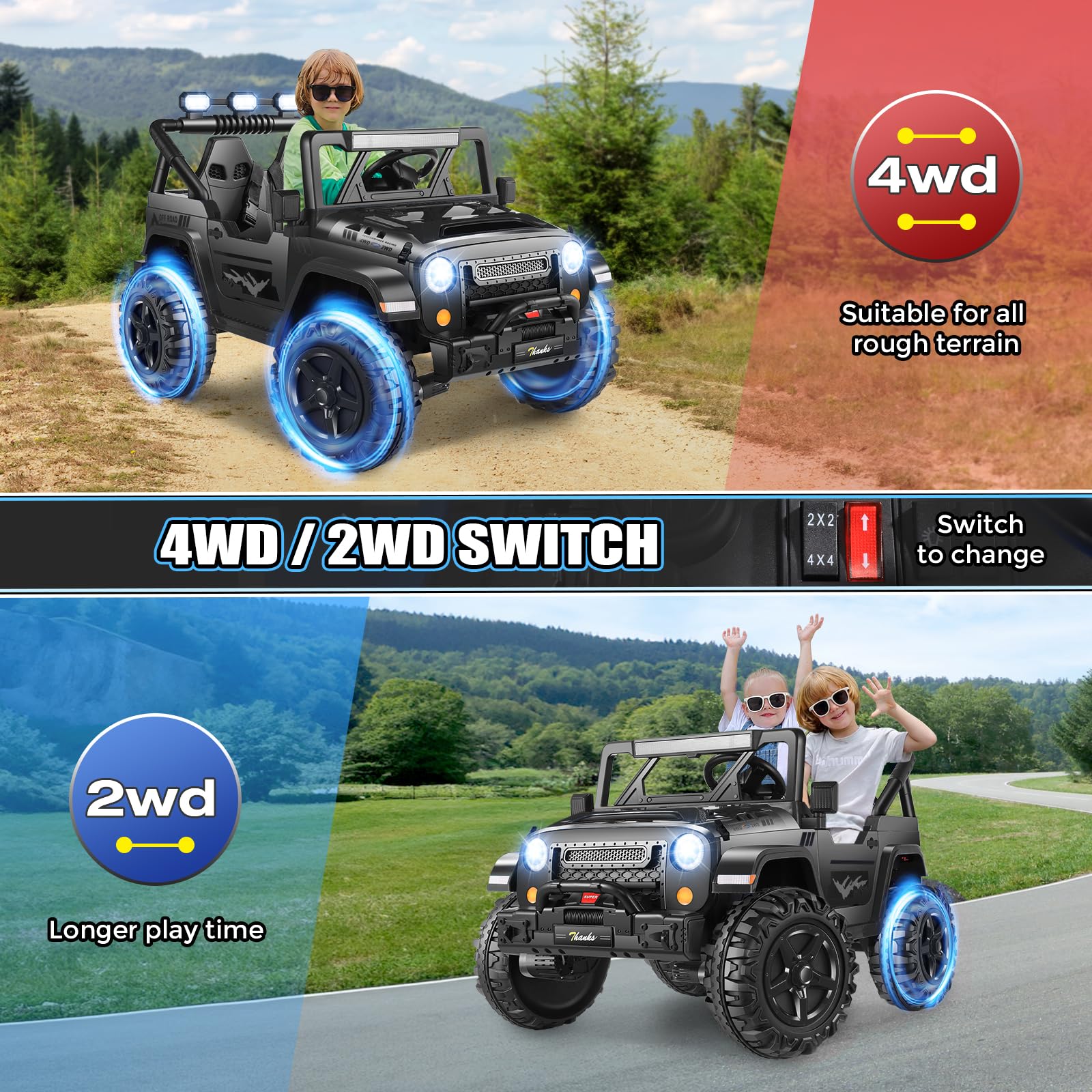 4WD/2WD SWITCHABLE: Equipped with a powerful 24V7AH battery and four 200W motors, this 24v kids car delivers continuous power. Easily switch between four-wheel and two-wheel drive with a single button. In 4WD mode, the ride-on car can tackle rugged terrains, while 2WD mode extends playtime for kids. Realistic Wide Double Seat: Featuring a 20'' wide double seat and dual safety belts, this 2-seater kids car is perfect for two kids with a combined age of up to 8 years to share the fun. It can also provide a solo adventure for one child aged 4-8 years. Parental Remote and Child-Driven: This 24v ride-on car comes with a 2.4G remote, ideal for parents to control for younger toddlers. The realistic manual driving mode is perfect for older kids to enjoy a self-driving experience. Easy Operation, Realistic Driving: With a clear control panel and simple steering wheel control, even young children can operate it easily. The music player plays preset tunes and connects to phones or USB for kids' favorite songs or stories. Realistic features like a touch pedal, horn, engine sounds, and LED lights create an authentic driving experience. Perfect Gift Choice: Overall dimensions: 47.6'' (L) x 33'' (W) x 32.2'' (H). The multifunctional dashboard, USB/Bluetooth/MP3 music player, responsive pedals, engine sounds, and dazzling lights offer the most realistic driving experience for your child. An ideal Christmas or birthday gift for boys and girls!''