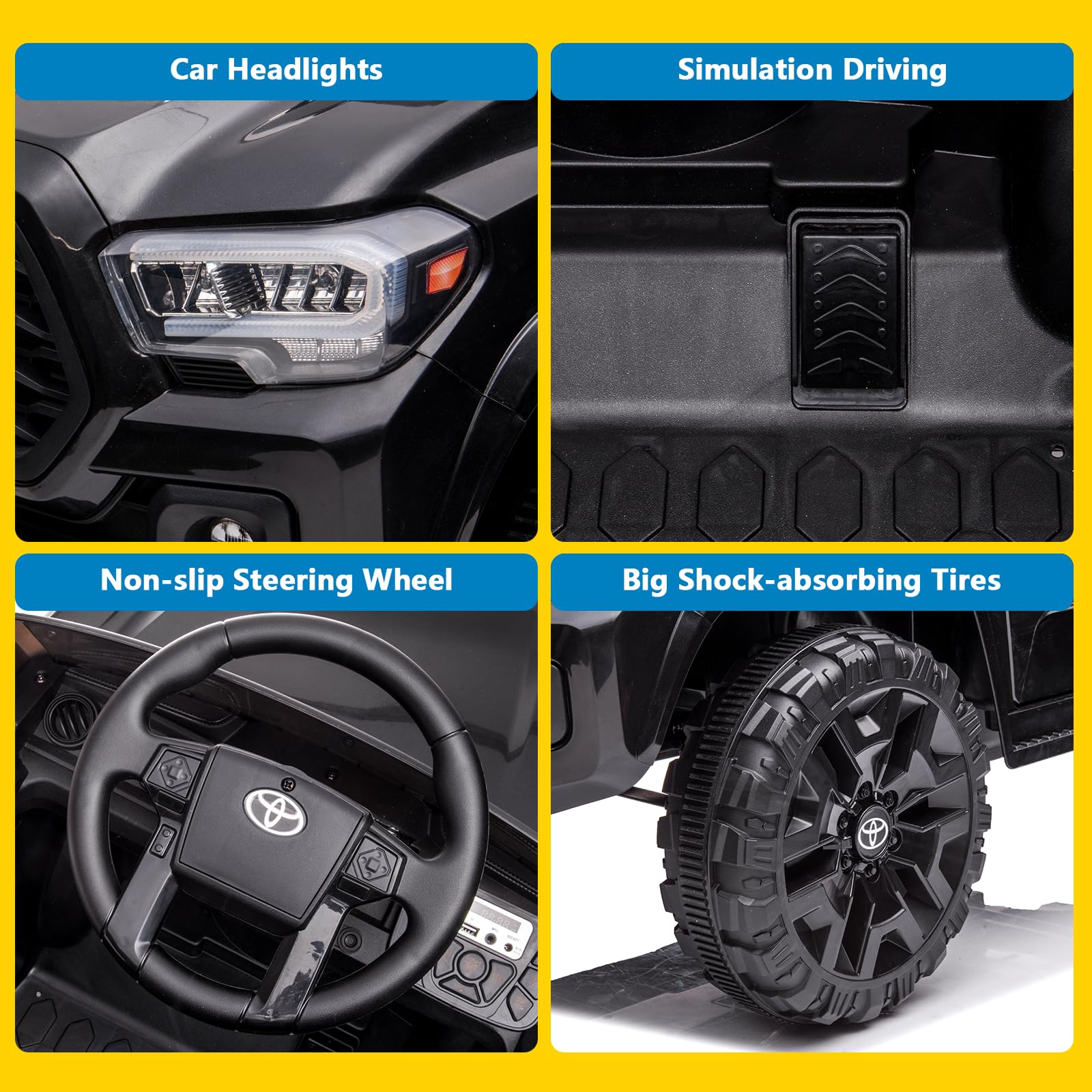 ??Licensed Toyota Tacoma??: This officially licensed car features an authentic design by Toyota Tacoma, including functional multimedia, a responsive steering wheel, and a foot pedal, offering an immersive experience for kids lovers | ??Powerful Performance??: Enjoy exciting driving in this kids ride on car featuring dual 25-watt motors, offering low/high speed of 1.24-2.49 mph; the robust 12-volt 4.5 AH battery provides up to 75 minutes of playtime, ensuring uninterrupted fun | ??Dual Control Modes??: This electric truck features both pedal control and remote control options; kids can enjoy a realistic driving experience using the foot pedal, while parents can ensure safety with the remote for interactive playtime | ??Safety First??: Designed for comfort, this battery powered car for kids is engineered with big shock-absorbing tires for a smooth and stable ride on bumpy roads; this toy car also features a 3-point safety harness to ensure secure seating | ??Fun and Functional??: This ride on truck boasts a clear operational panel, headlights, and USB music, creating a multi-sensory play environment that maximizes entertainment for little ones weighing up to 62 lbs