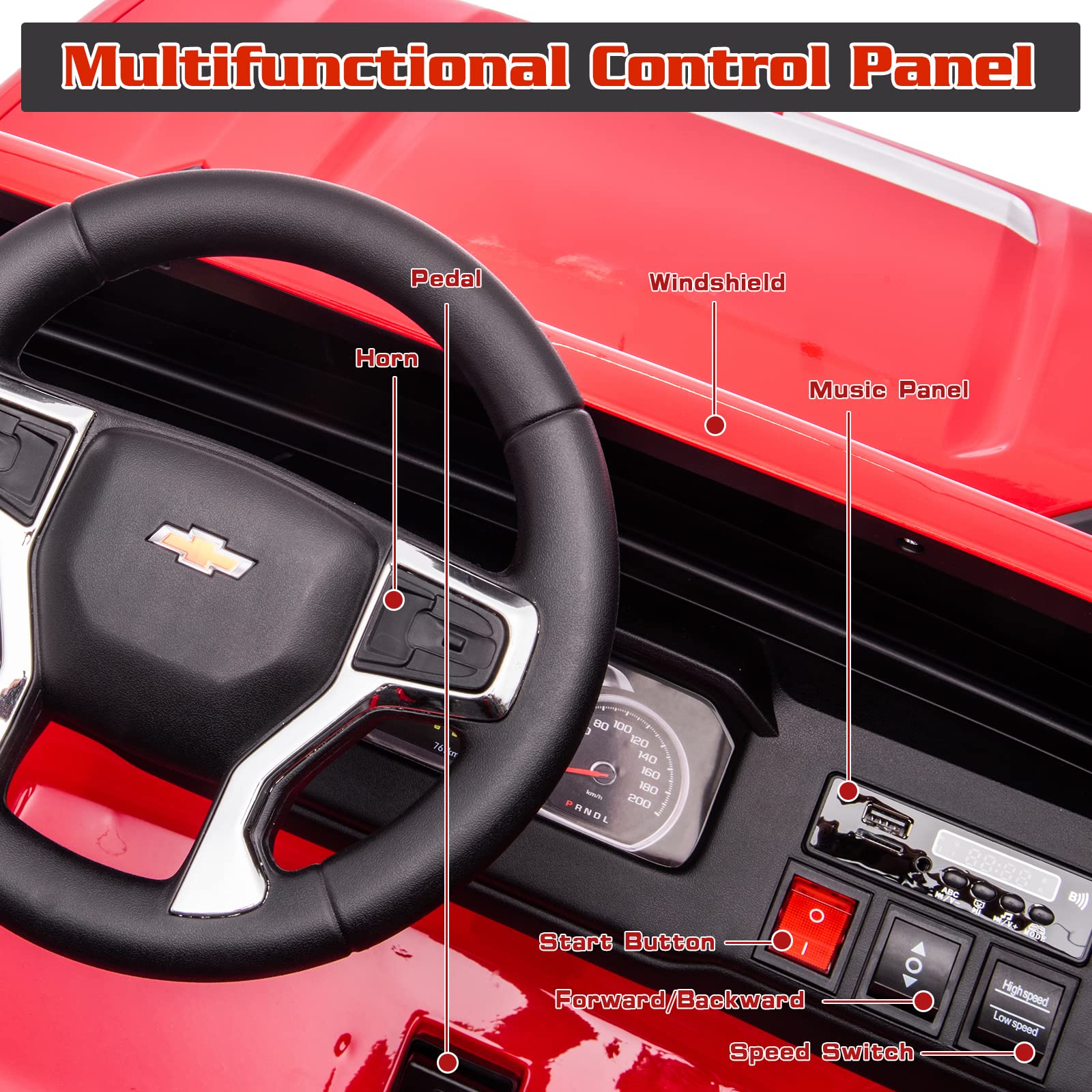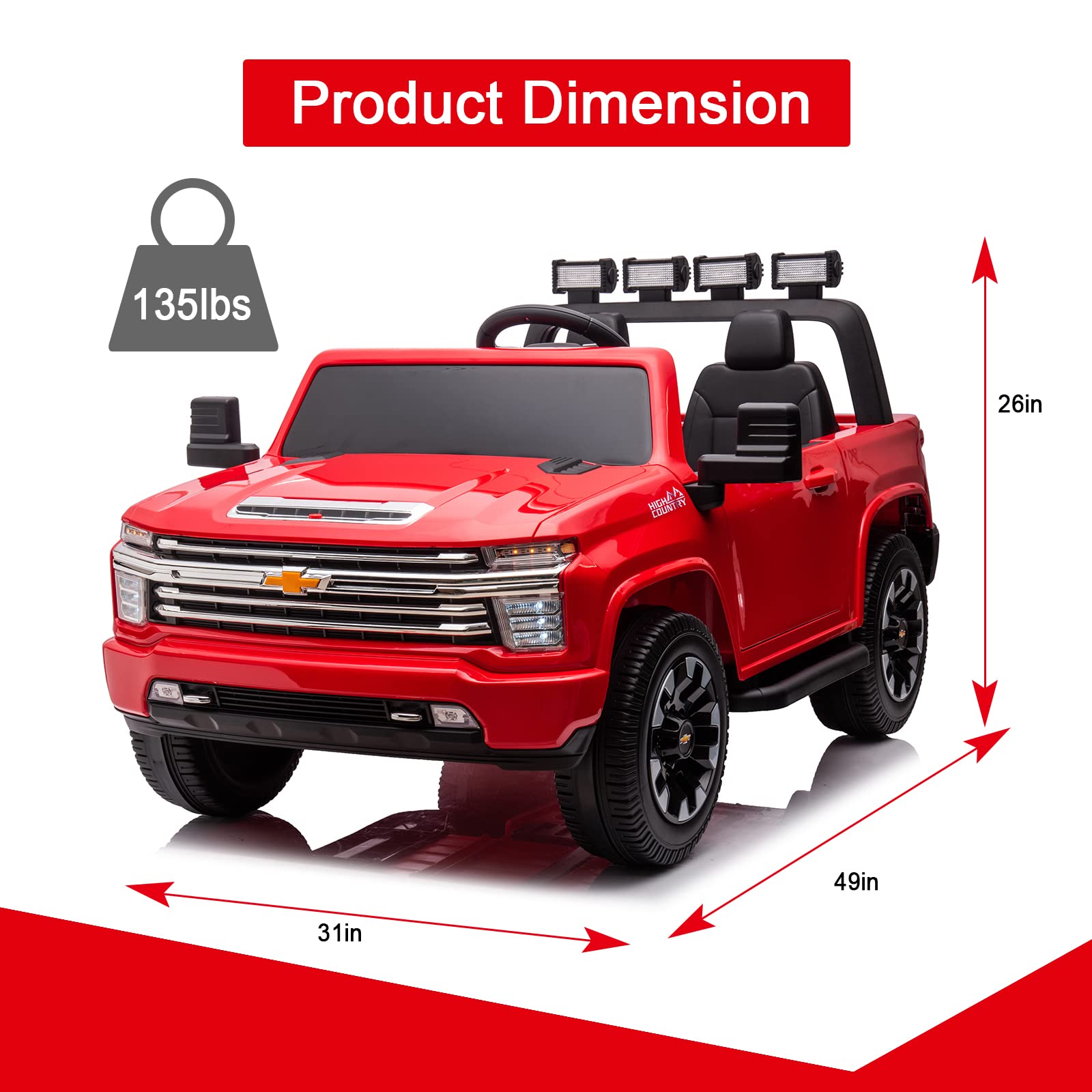 [Official Licensed Kids Car] This ride on car is official licensed with the realistic appearance of Chevrolet Silverado HD. It has openable doors, spacious 2 seats with seat belts, bright LED headlights, decorative spotlights and storage trunk. Featuring with these eye-catching appearance designs, our toy car is an ideal gift for children. Max load capacity: 130 lbs | [24V 2-Seater Kids Ride On Car] Our 2-seater kids ride on toy car equipped with 24V rechargeable battery and powerful motors, which can provide an exciting driving experience. The EVA wear resistant tires with shock absorber allow your kids drive the car smoothly in any terrains. Speed range: 2.5-4.4 mph | [Kids Electric Vehicle with Remote Control] Our 2-seater kids electric toy car has two driving modes. Kids can drive the truck around easily through the foot pedal and the steering wheel, provide your kids a real driving experience. The 2.4G remote control allow parents override your little driver when it is necessary and avoid the accident. | [Drive with Music Function] Our 24V kids electric car is equipped with a multifunctional music panel which has built-in music, USB, TF card slot, AUX port and wireless Bluetooth connection, you can connect your devices to the car and let your kids enjoy their favorite music while driving. | [Best Toy Car Gift for Kids] Our kids ride on Licensed Chevrolet truck is built with kids-friendly PP plastic and durable metal material which has passed ASTM F963 certification. With interesting music function and cool appearance, it is a fantastic gift for boys and girls on Birthday, Halloween, Christmas, New Year!