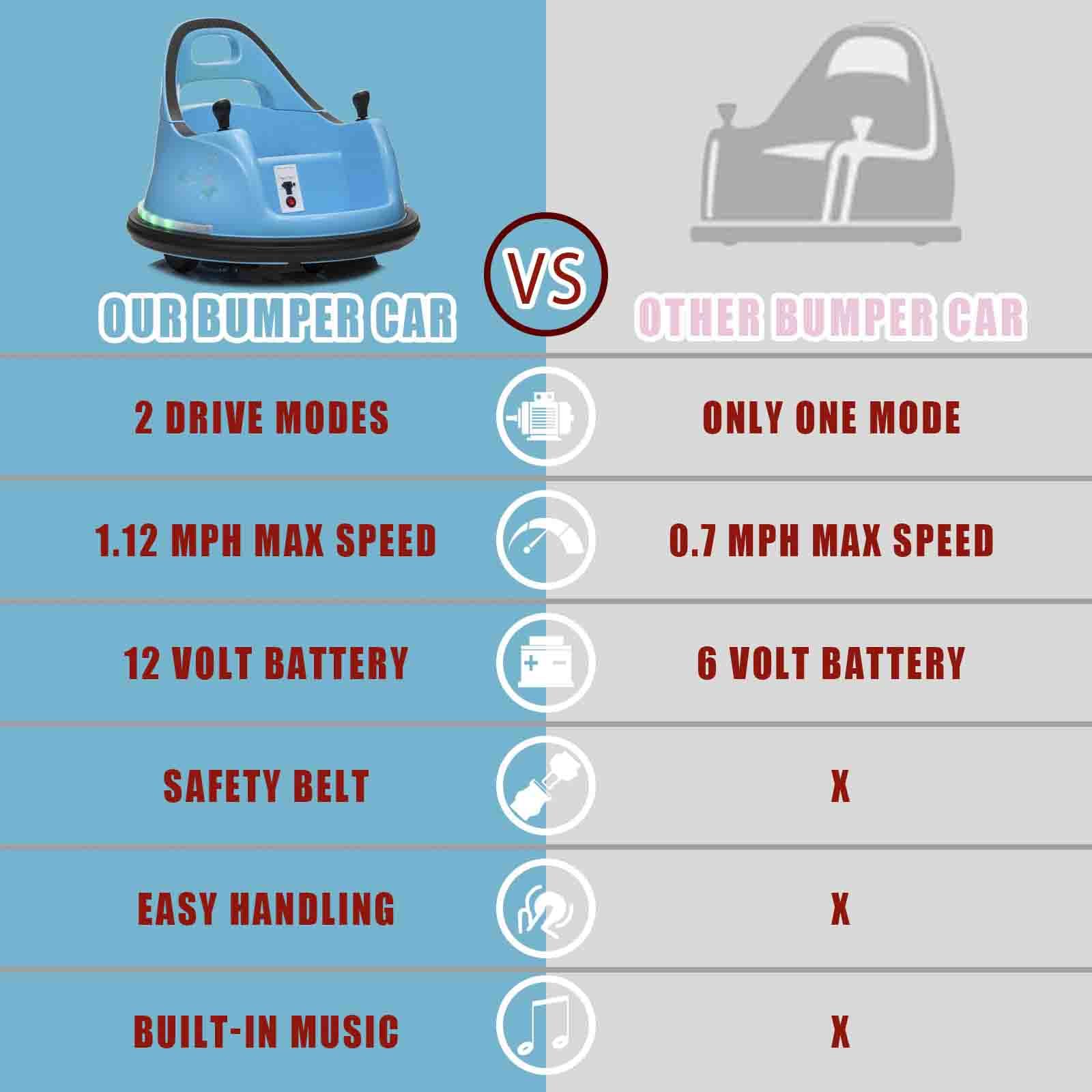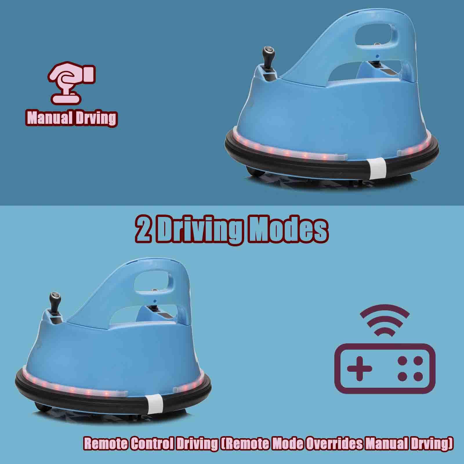 [Unique Ride on Toy Car] Our ride-on bumper car is advanced and toddler-friendly than other ride on toy car. Kids ride on bumper car is suitable for a variety of scenarios, such as wooden, floor tiles, carpets and concrete floors. Electric toy car can reach speeds of up to 1.12 mph | [360 Degree Spin] Kids can use the electric bumper car to ride, race, spin and bump all around the indoor and outdoor. Electric toy bumper car with 360 degree spin for more riding fun. The maximum weight capacity is 66 lbs | [2 Driving Mode] Our ride on bumper car for kids has manual driving mode and remote control driving mode.Parents can use remote control to control bumper cars, which can ensure your kids safe riding. And children can ride bumper cars to enjoy the interesting of independent driving | [Safety Features] Kids bumper car is equipped with seat belts and 2 control knobs which can be held by kid while playing so that safeguards the child's safety. Ride on electric vehicles bumper car also designs for anti-collision strip so that kids use the 360 degree turning radius to make maneuvering simple and avoid danger | [Built-in Music for Fun] Kids ride on electric bumper car is equipped with built-in music, which can let your children enjoy their favorite music or songs while crashing or playing. Ride on bumper car is also equipped with bright colorful LED lights, which make your kids to drive more cool and fun
