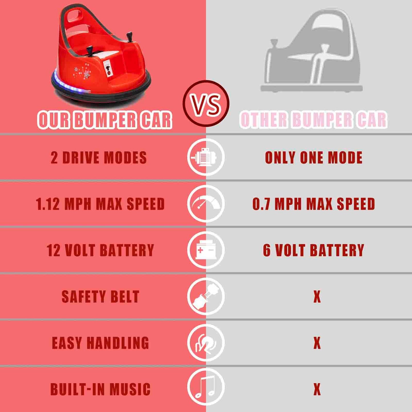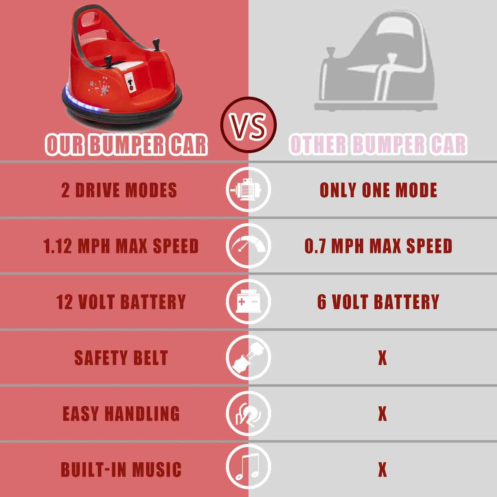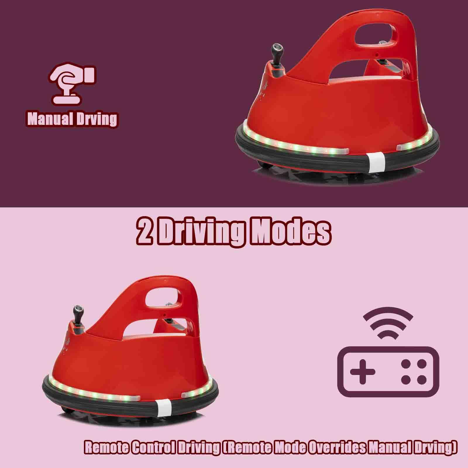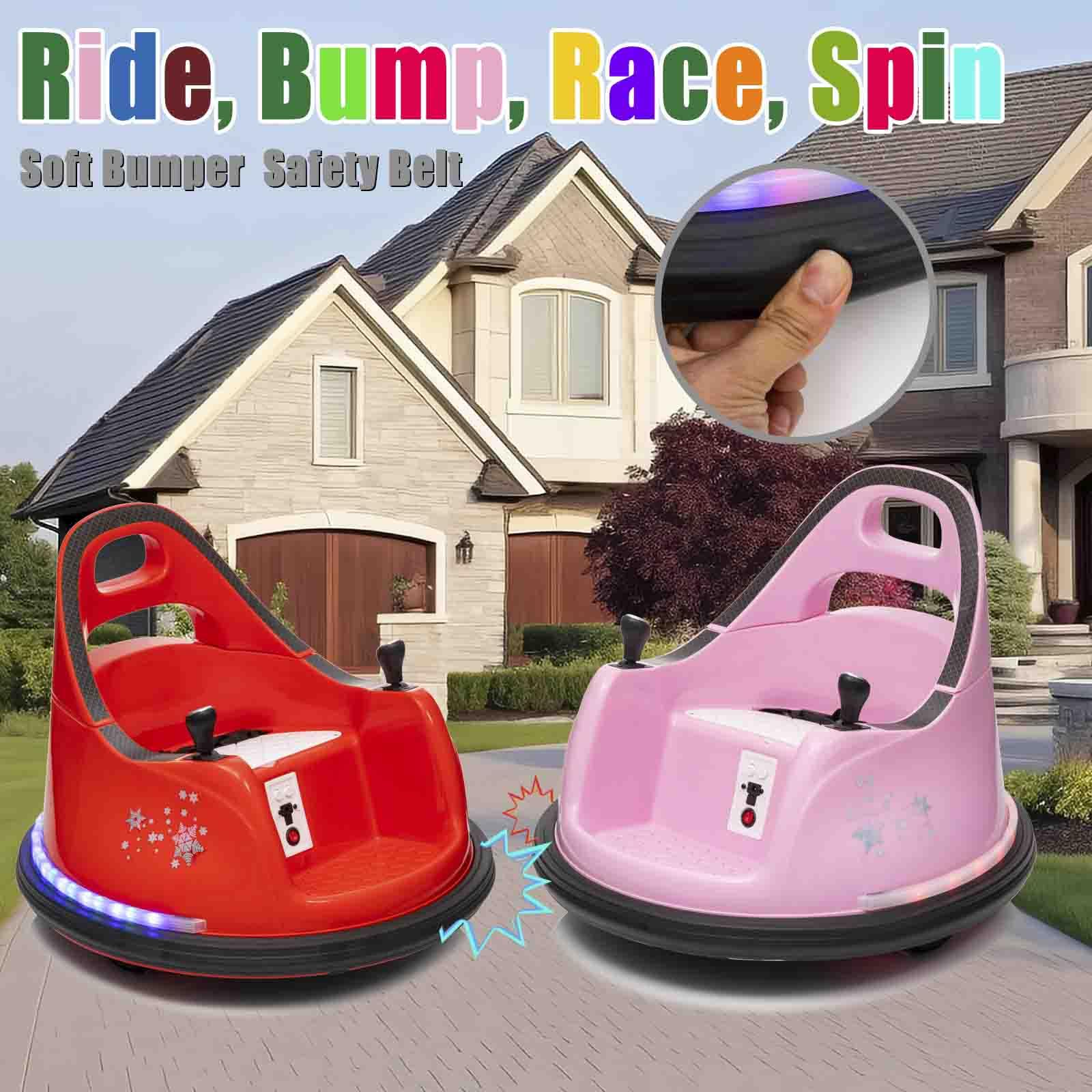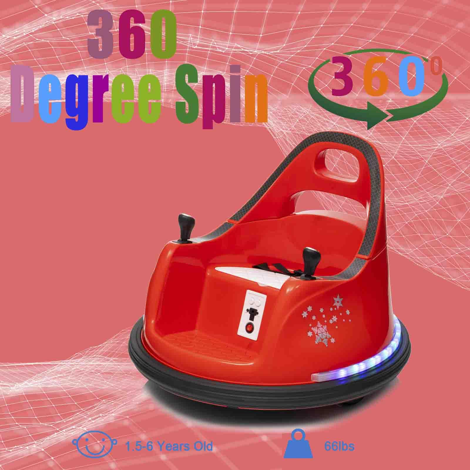 [Unique Ride on Toy Car] Our ride-on bumper car is advanced and toddler-friendly than other ride on toy car. Kids ride on bumper car is suitable for a variety of scenarios, such as wooden, floor tiles, carpets and concrete floors. Electric toy car can reach speeds of up to 1.12 mph | [360 Degree Spin] Kids can use the electric bumper car to ride, race, spin and bump all around the indoor and outdoor. Electric toy bumper car with 360 degree spin for more riding fun. The maximum weight capacity is 66 lbs | [2 Driving Mode] Our ride on bumper car for kids has manual driving mode and remote control driving mode.Parents can use remote control to control bumper cars, which can ensure your kids safe riding. And children can ride bumper cars to enjoy the interesting of independent driving | [Safety Features] Kids bumper car is equipped with seat belts and 2 control knobs which can be held by kid while playing so that safeguards the child's safety. Ride on electric vehicles bumper car also designs for anti-collision strip so that kids use the 360 degree turning radius to make maneuvering simple and avoid danger | [Built-in Music for Fun] Kids ride on electric bumper car is equipped with built-in music, which can let your children enjoy their favorite music or songs while crashing or playing. Ride on bumper car is also equipped with bright colorful LED lights, which make your kids to drive more cool and fun