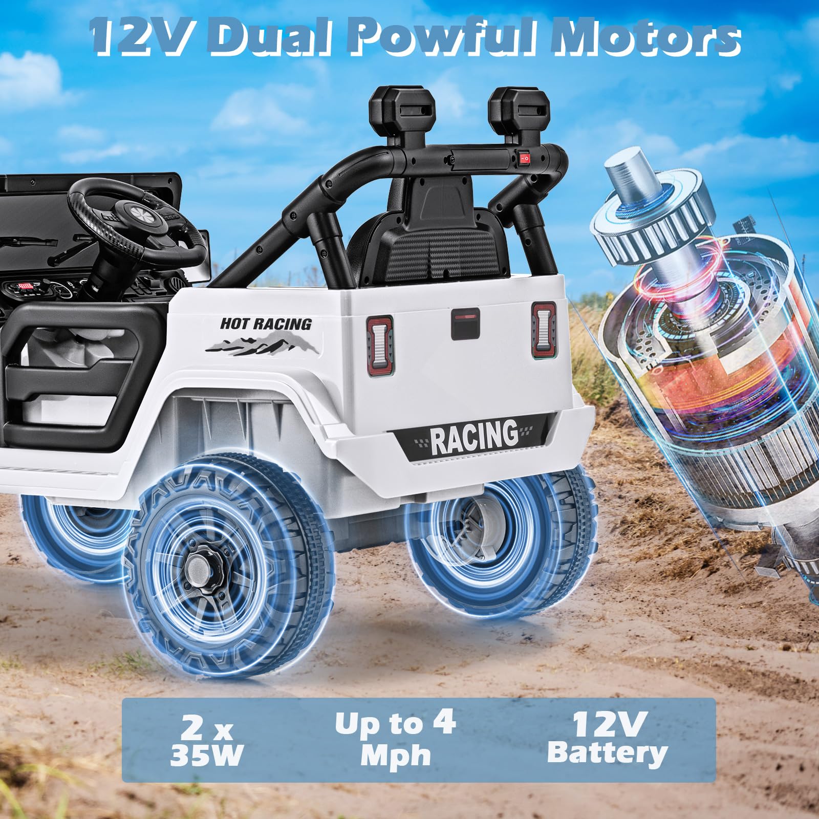 Olakids Ride On Truck, 12V Battery Powered Electric Vehicle For Kids With Remote Control, Bluetooth, Power Display, Led Lights, Music Player, Ride On Toy For 3+ Boys Girls (White)