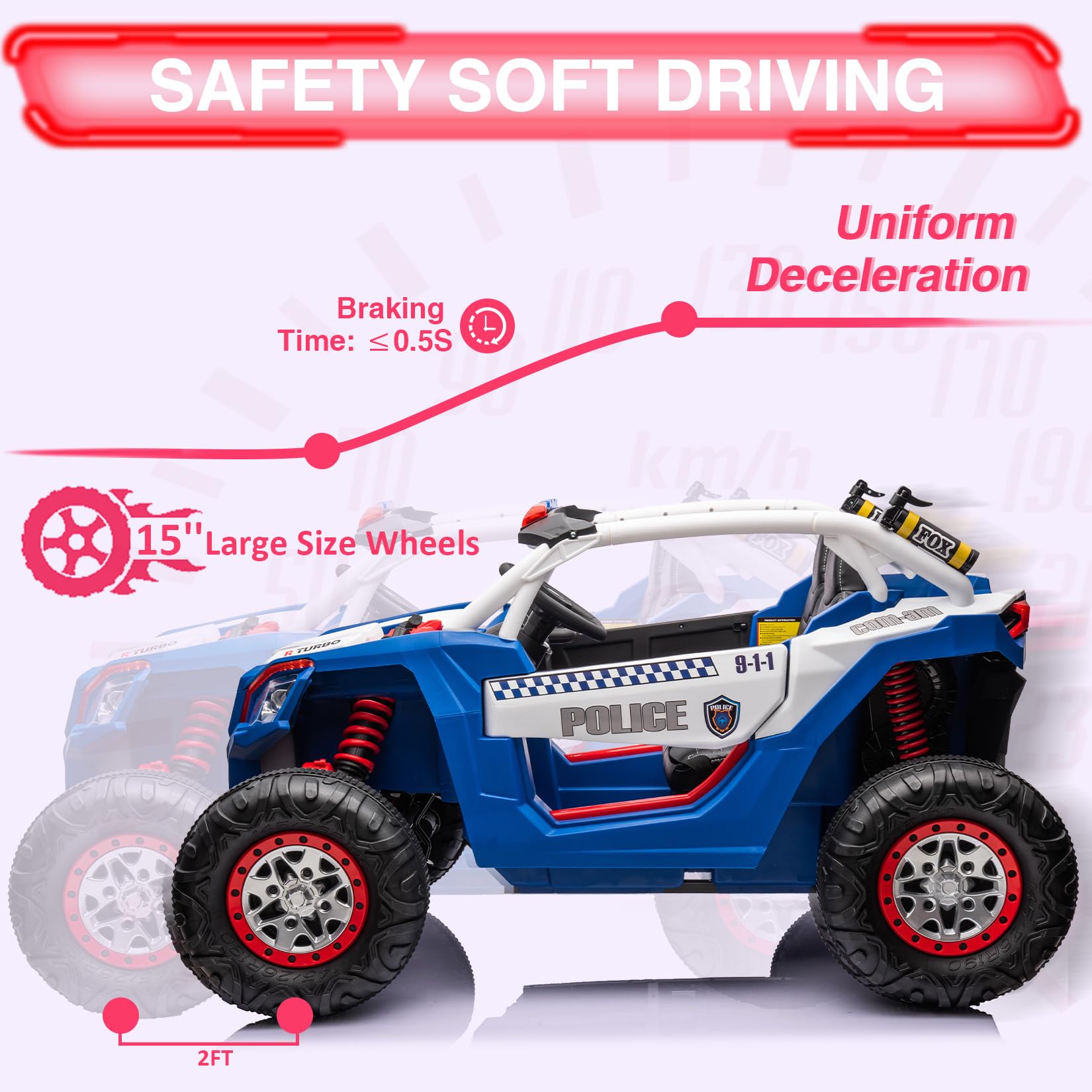 ?Powerful 24V Engine & Large Battery?This 24V ride-on car is equipped with a 24V/4X75W motor, providing robust and stable power in any situation. Your kids will enjoy the best experience while staying safe. It also includes a high-capacity 7AH battery, delivering up to one hour of continuous playtime. The full-metal suspension system enhances shock absorption, reducing the impact of rough terrain. | ?2 Seater & 2 Driving Modes?The Hetoy 2 Seater UTV features an extended seat length of up to 24.8'', accommodating two kids to play together, offering double the fun in one toy. The built-in seat belt ensures child safety. It supports two driving modes: parental remote control and manual operation for kids. Parents can use the 2.4G remote control when kids are too young. | ?Smooth Braking & Easy-Drag 4WD?Advanced smart chips enable soft braking and Easy-Drag technology. The customized soft braking system ensures safety and minimal impact during emergency stops. Easy-Drag technology allows for automatic shut-off of the front wheel motor when the car is turned off, making it easy to move the car with the front wheels. | ?Outstanding Safety Features?The addition of 5 Auto-reset Overheat Protectors prevents overloading of the drive motors and circuits during normal use. Wear-resistant wheels with full metal suspensions reduce the impact of rough terrains. The seat is equipped with a seat belt, and the double safety locks on the openable doors provide comprehensive safety protection for kids. | ?Specifications?Overall size: 52.4x36.2x31.5 IN (L x W x H). Wheel diameter: 15''. Maximum Load: 132 LBS (60KG). Battery Capacity: 7AH. Playtime: Approximately 50-70 minutes (varies based on load, speed, road surface & temperature). Additional Functions: Music Player, Bright Lights, Radio.