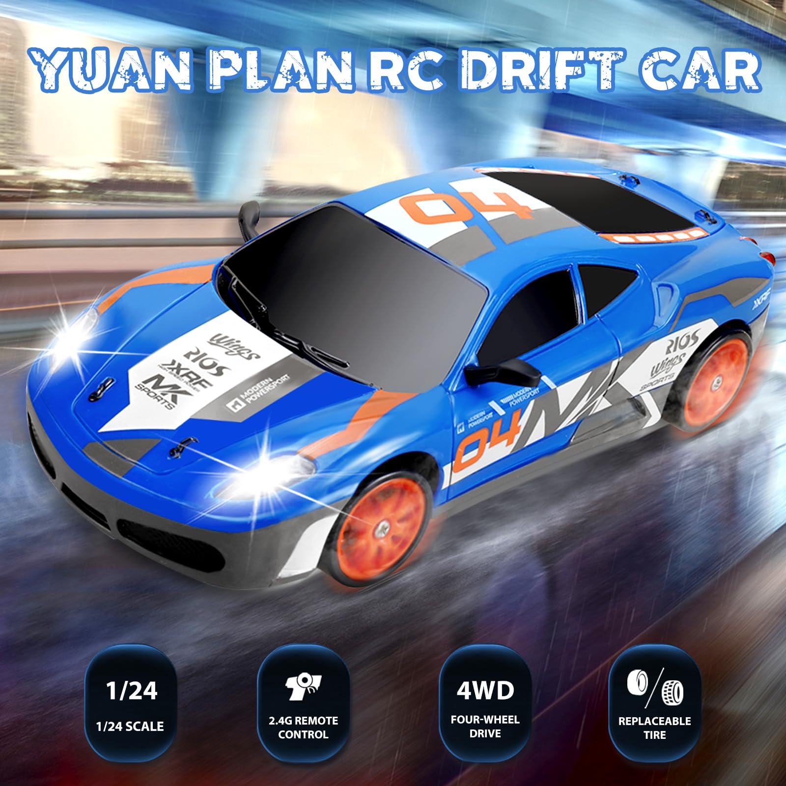 YUAN PLAN Remote Control Car RC Drift Car 2.4GHz 1:24 Scale 4WD 15KM/H High Speed, Rechargeable High Speed RC Cars with Cool Lig