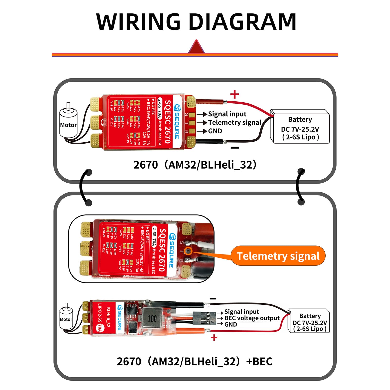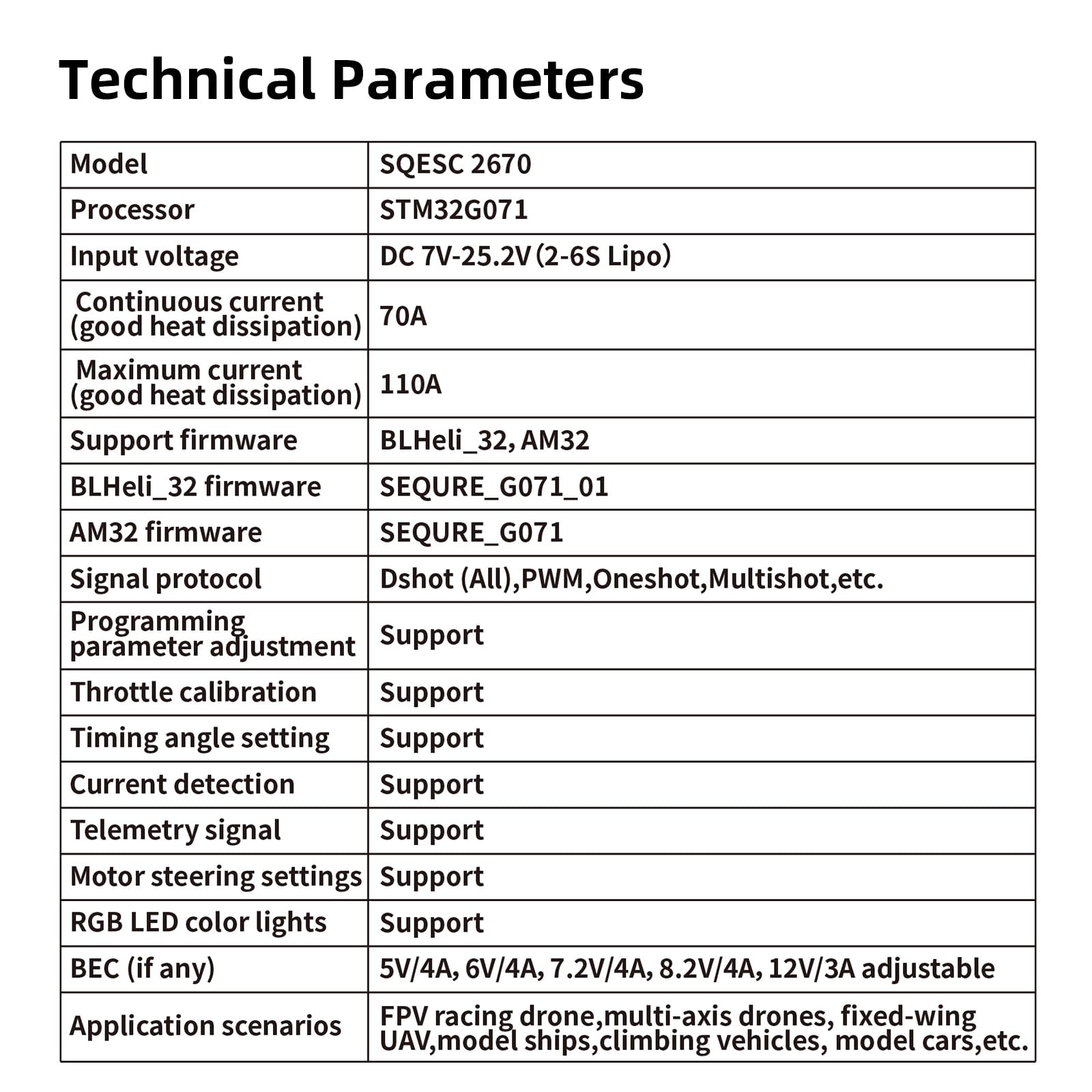 SQESC 2670 Brushless ESC BLHeli_32 Electronic Speed Controller 2S-6S Lipo Technical Parameters Model Name: SQESC 2670 Processor: STM32G071 Firmware: BLHeli_32 Input Voltage: DC 7V-25.2V(2-6S Lipo) Constant Current: 70A Maximum Current: 110A BEC Output: 5V/4A, 6V/4A, 7.2V/4A, 8.2V/4A, 12V/3A Signal Protocols: Dshot (All), PWM, Oneshot, Multishot, etc. Programmable parameter adjustments: Yes Steering Setting of the Motor: Yes Accelerator calibration: Yes Boost Timing Setting: Yes Current Detection: Yes Telemetry signal: Yes RGB LED Light: Yes Features: PCB adopts an 8-layer 3OZ immersion gold process, high-power MOS combined with a metal heat sink, which can effectively dissipate heat under high current load and continue to work stably. Visual programming parameter adjustment tool supports motor timing, throttle calibration, current detection, motor steering, telemetry signal, and other settings. Onboard RGB LED color light settings, multiple LED colors can be customized. Widely used in FPV racing drones,multi-axis drones, fixed-wing, ship models, climbing vehicles, car models, and other scenarios NOTE: If you need to configure the parameters, please use the ESC-Link configuration tool to change the parameters. ESC-Link is compatible with AM32 and BLHeli_32.
