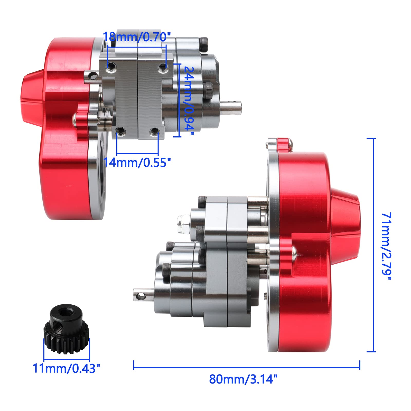 Specifications: Materials: Main Body and Cover: anodized premium aluminum alloy. Gears: steel. Dimensions: as the picture shown. Applications: Fits for Axial SCX10, SCX10 II 90047, AX10 (Not for AXI90046). Package Included: 1 Transmission Gearbox 1 Steel Pinion Gear 1 Pack of Mounting Screws