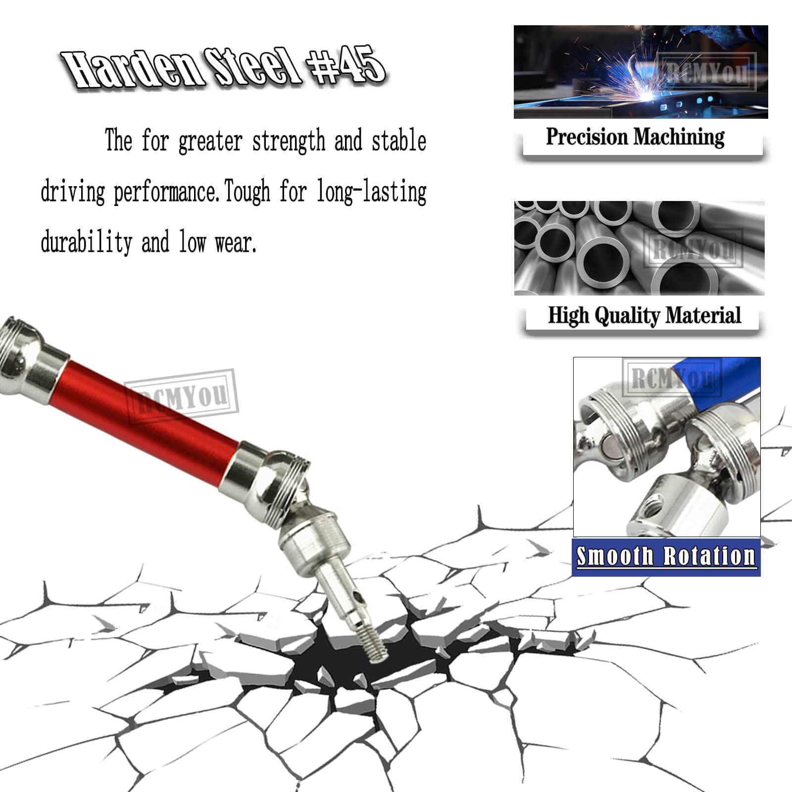 • Q: How does the CVD drive shaft enhance the performance of my RC car? A: The CVD drive shaft is made from hardened steel #45, offering greater strength and stable driving performance, which contributes to long-lasting durability and reduced wear during operation.
