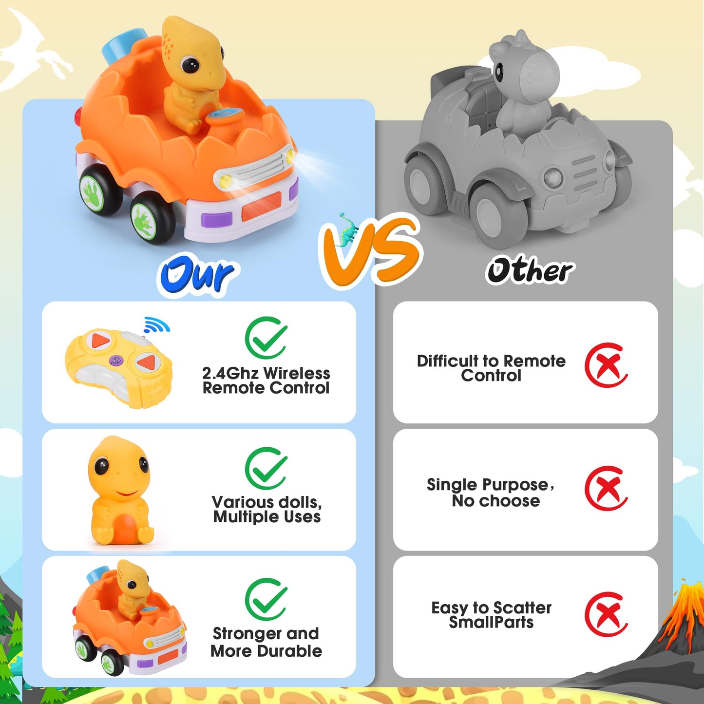 View comparetaseyok 2 Pack Remote Control Car for Toddlers, Dinosaur Toys for Kids 2-6, Toddler Sensory Toys with LED Lights and Sound, Chri