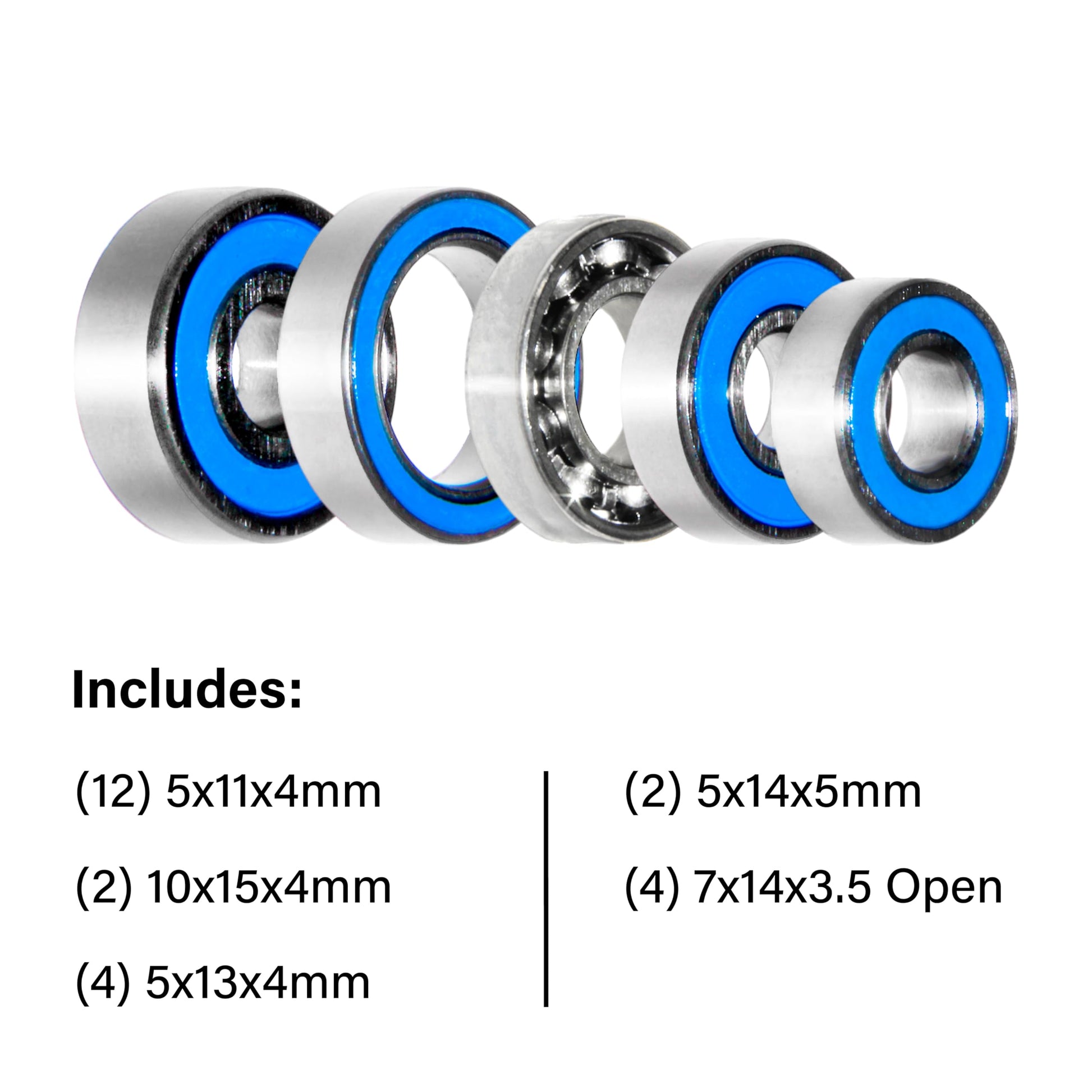 - Q: How many bearings are included in the kit, and what are their sizes? A: The kit includes a total of 24 premium bearings, with specific sizes for the front and rear axles, such as 10x15x4mm, 5x11x4mm, and more.