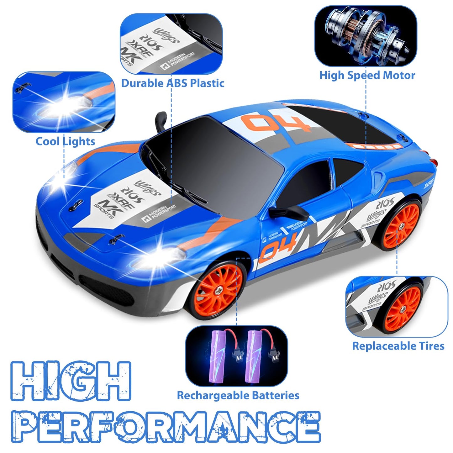 - Q: What features does the remote control offer? A: The remote control features forward and reverse movement, left/right turns, front LED lights, and advanced drifting capabilities like U-shaped and figure 8 drifts.