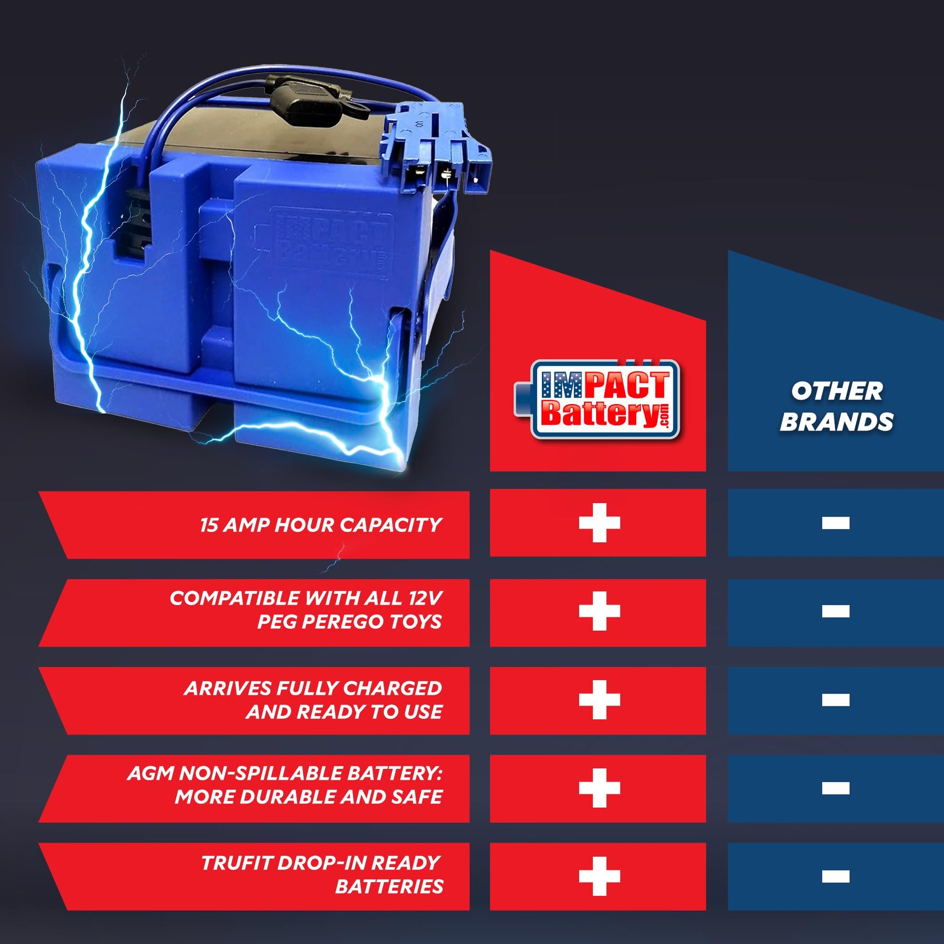 This 12V replacement battery kit will come fully assembled and fully charged. It can be used in all 12 volt ride-on-toy applications licensed by Peg Perego including the Case IH Magnum tractor, John Deere tractor and loader, John Deere Gator XUV (Does NOT work with a John Deere Gator HPX), Polaris RZR 900, Polaris Outlaw ATV, New Holland T8 tractor, Ducati motorcycles and Gaucho Rocklin Jeep. Original & replacement batteries may be identified as follows: CF12V12-T, IAKB0501, IAKB0502, DJW12-12HD, DMU 12-12, 2606FR, NP12-12. We also have a 12V Peg Perego battery replacement that is 15 amps instead of 12 amps. The 12Ah and 15Ah are NOT direct replacements for the 7, 8, or 9Ah batteries, but will fit in and operate toys that originally came with one of those smaller batteries. Most of the ride-on-toys will come with the smaller 12V 7Ah battery held in place with a hold down bracket and plastic spacer. Remove the plastic spacer to install and enjoy the longer lasting 12V 12Ah battery. The battery compartment is pre-made to accept the bigger sized Peg Perego replacement battery.