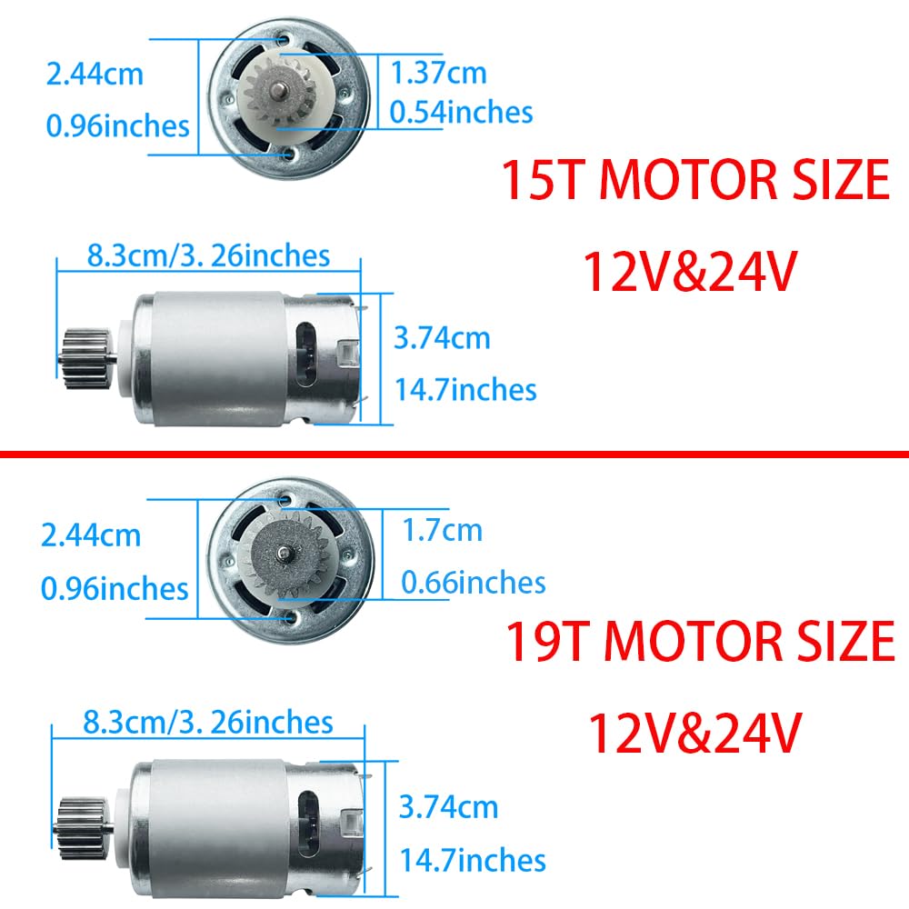 Product: 2 motors, 2 motor cables Parameters: 12V 30000RPM/12V Power: 45W 24V 35000RPM/24V power: 200W How to purchase: 1. Before purchasing, please compare the original motor model to determine whether your motor is 15T or 19T (if the number of teeth is different, it cannot be replaced) 2. After determining the teeth of the motor, please confirm the battery voltage. If you have a 12V battery, please choose a 12V motor. If you have a battery of 18V or above, please choose a 24V motor