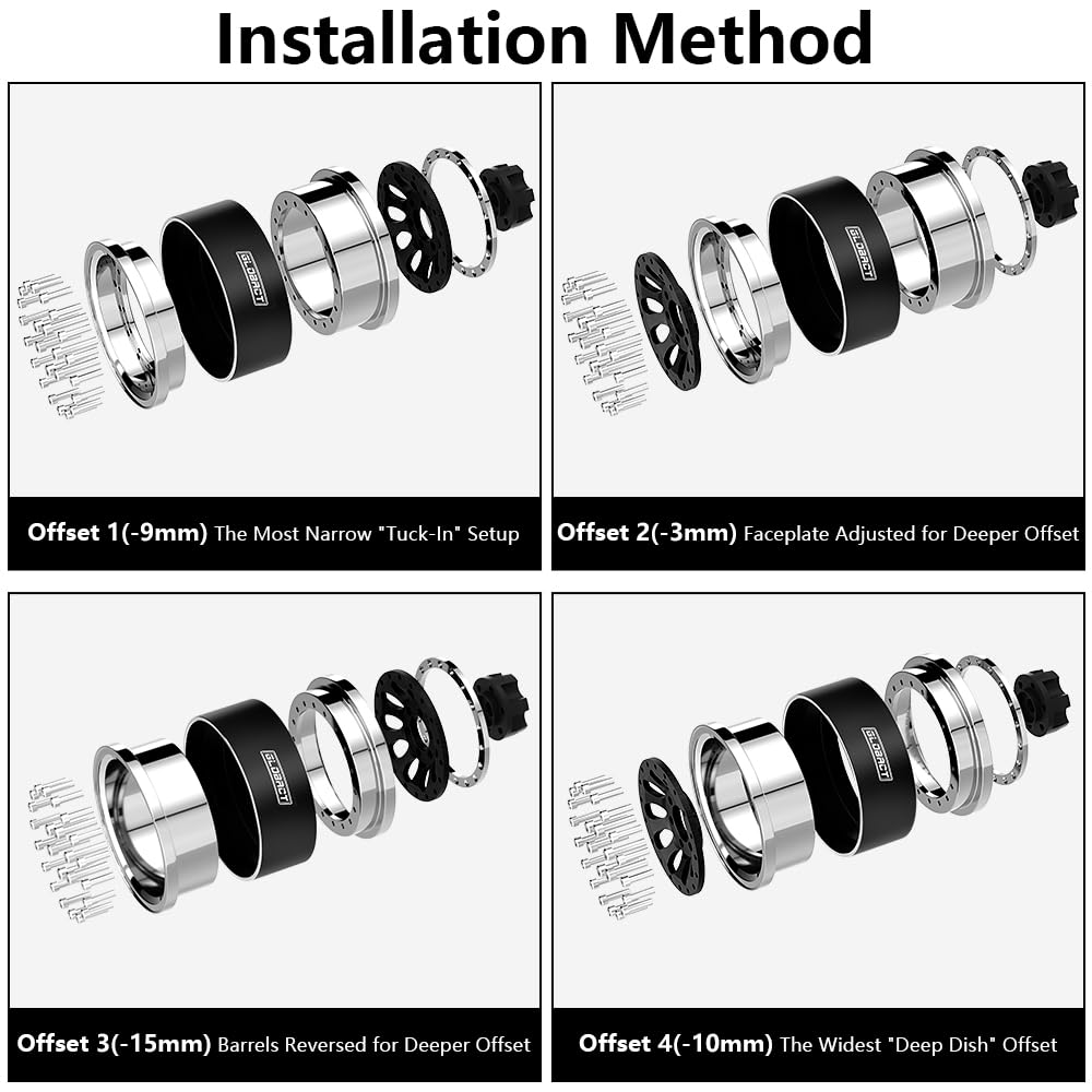 Specifications: Product Name: 1/10 Aluminum 1.9 Inch Beadlock Wheels Color: Black Material: Aluminum Diameter: 55.5mm/2.18'' Width: 30mm/1.18'' Hex Size: 12mm Wheel Offset: -3mm / -9mm / -10mm / -15mm (Adjustable 4 Offsets) Quantity: 4Pcs/Set Weight: 72.5g/0.159lb per wheel (fully installed) Package List: 4 * 1.9 Inch Beadlock Wheels 1 * Screw Pack