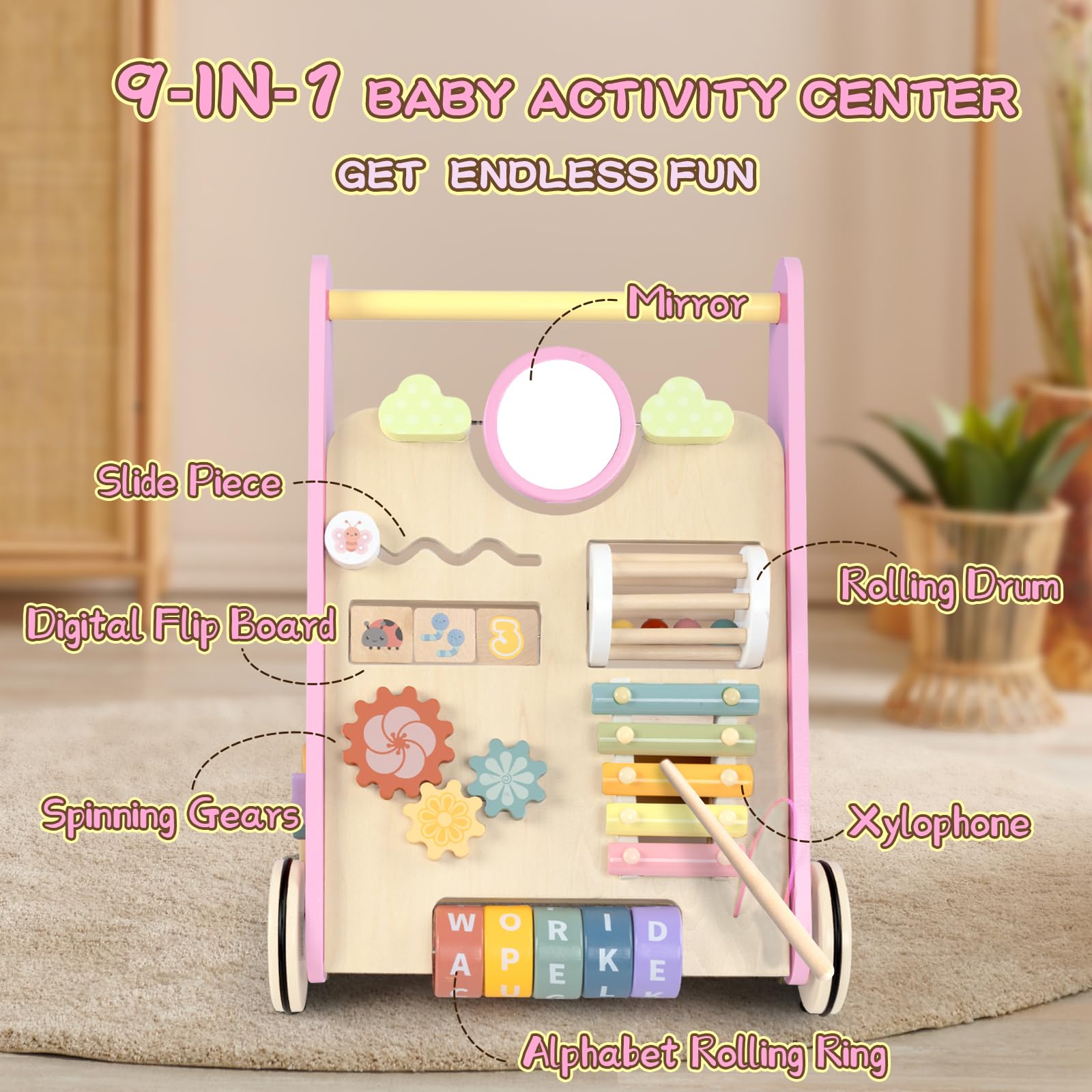Lol-Fun Wooden Baby Walker For Girls With Wheels, Baby Push Walker For Baby Girl 12 Months, Pink Baby Walker Push Toy For 1 Year
