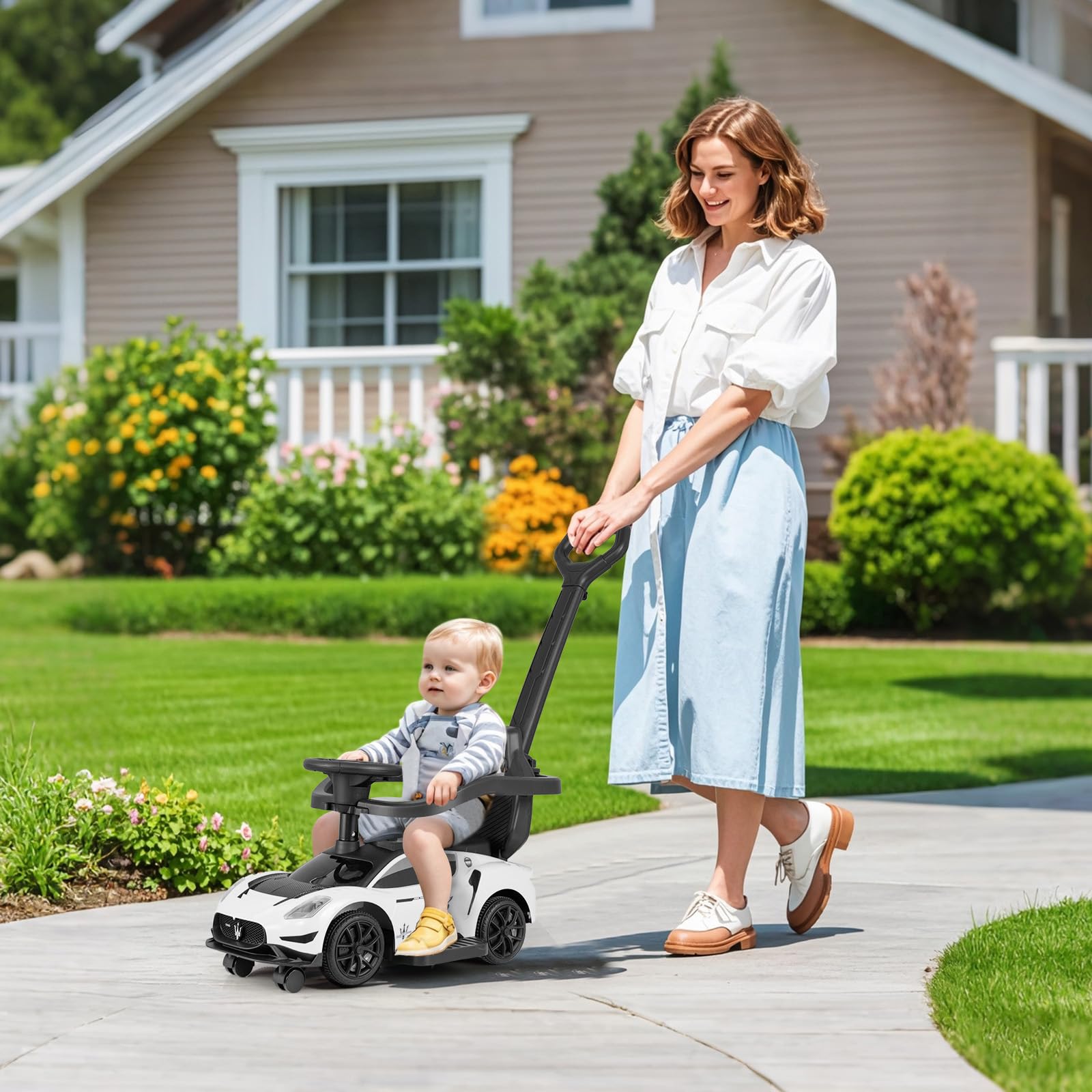 OLAKIDS 3 in 1 Ride on Push Car, Licensed Maserati Baby Sliding with Removable Parent Control Handle, Universal Wheels, Safe Guardrails, Toddlers Walking Toy with Music, Under Seat Storage (White)