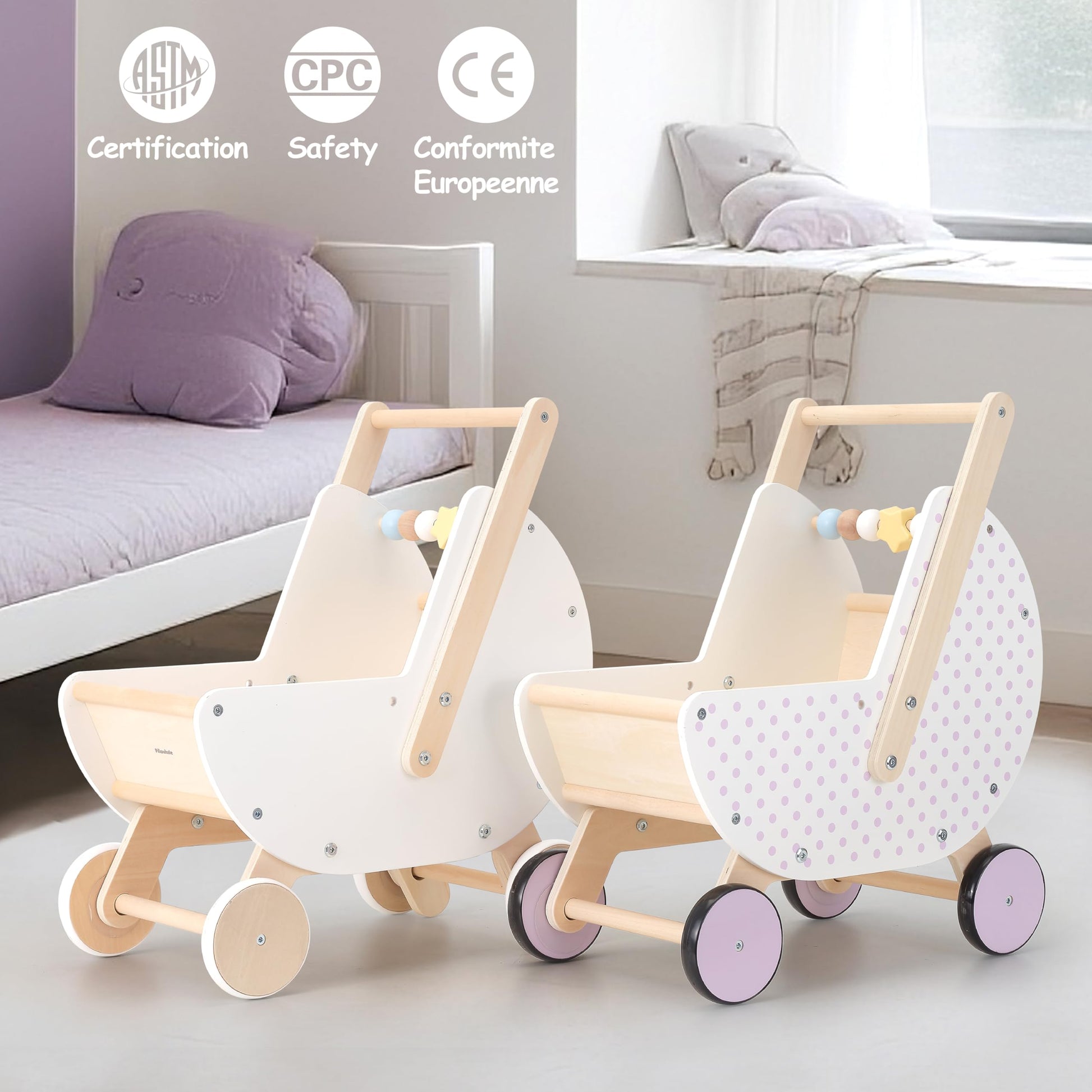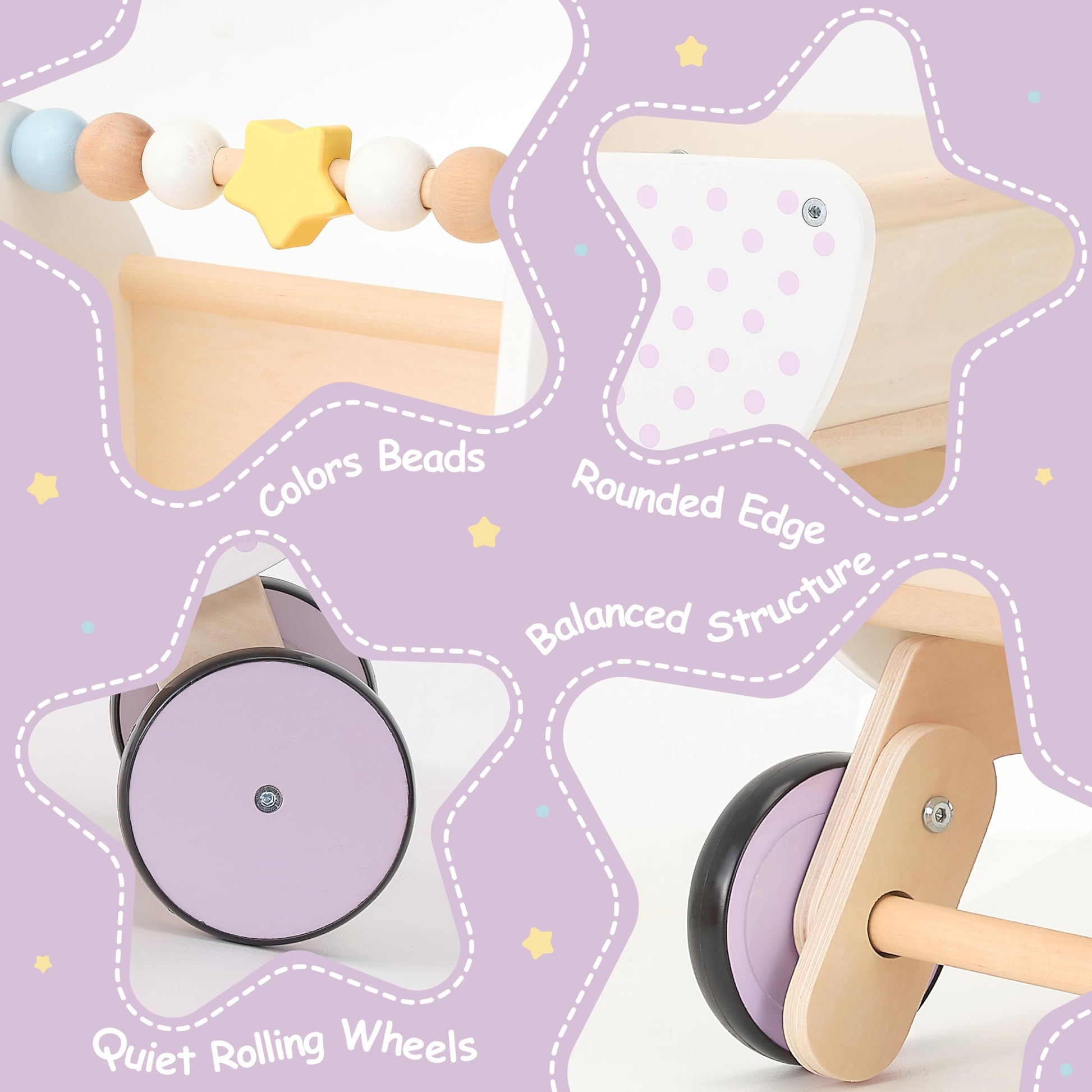 Give first steps a storybook backdrop with the Pillowhale 2-in-1 Wooden Walker & Baby Doll Stroller. Crafted from sustainably sourced beech, the crescent-moon body rolls on whisper-quiet wheels while an anti-tip chassis protects budding walkers. Flip the handle to switch from push-ahead walker to pull-behind pram-perfect for dolls, teddies or a basket of pretend groceries. A Montessori-style bead bar adds sensory play, and two calming colorways-Lavender Polka-Dot or Pure White-blend seamlessly into modern nurseries. Designed for toddlers 12 months +, lab-tested to U.S. toy standards.