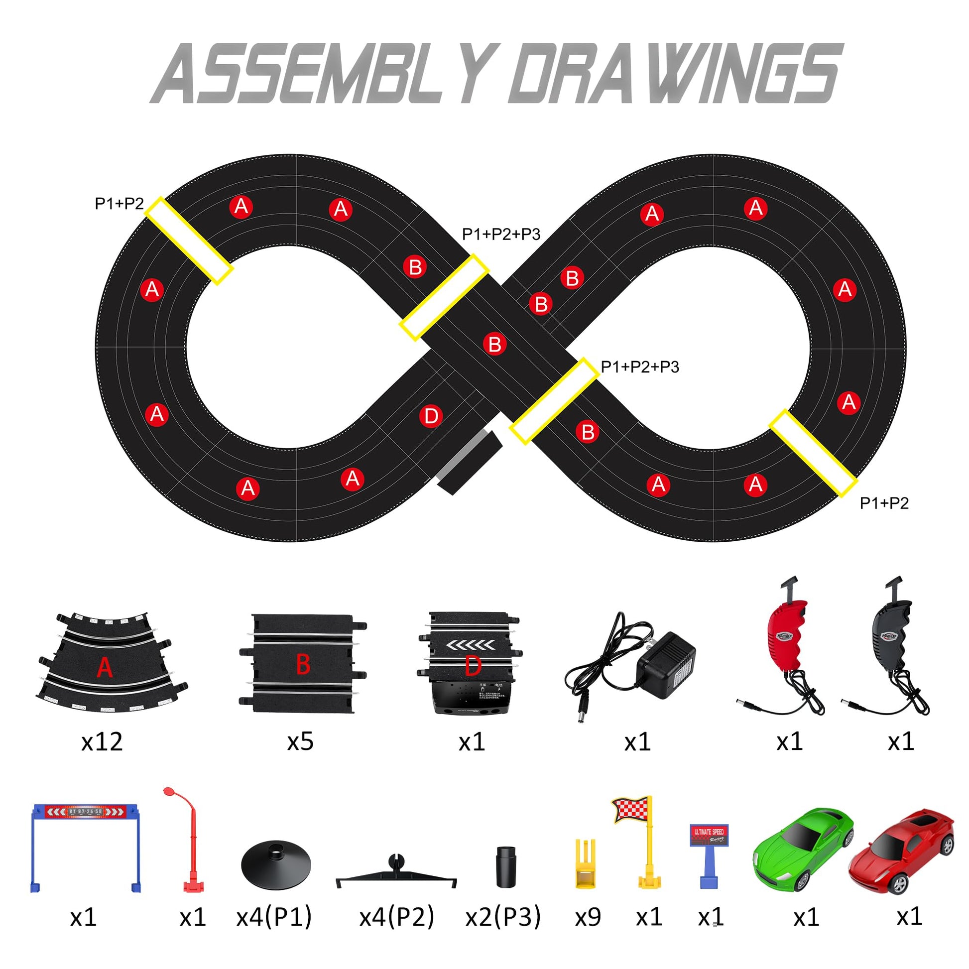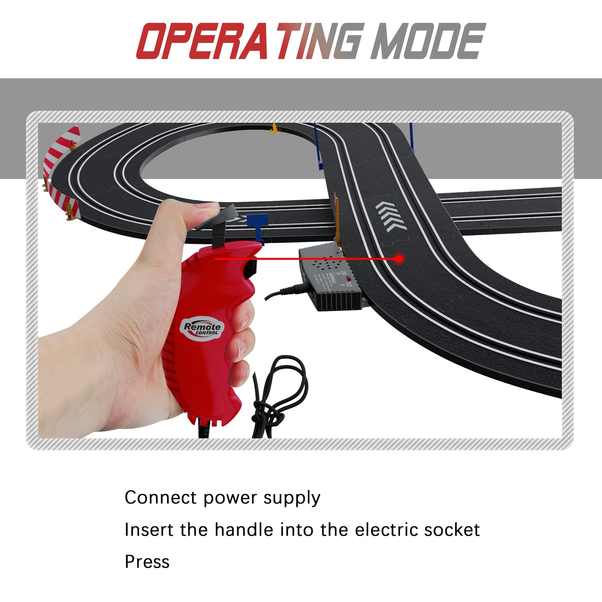 - Q: How does the electric-powered slot car race track work? A: The electric-powered slot car race track operates using a speed limiter that maintains a perfect speed for completing loops and curves. It also features an electric booster button for added excitement on straight sections.