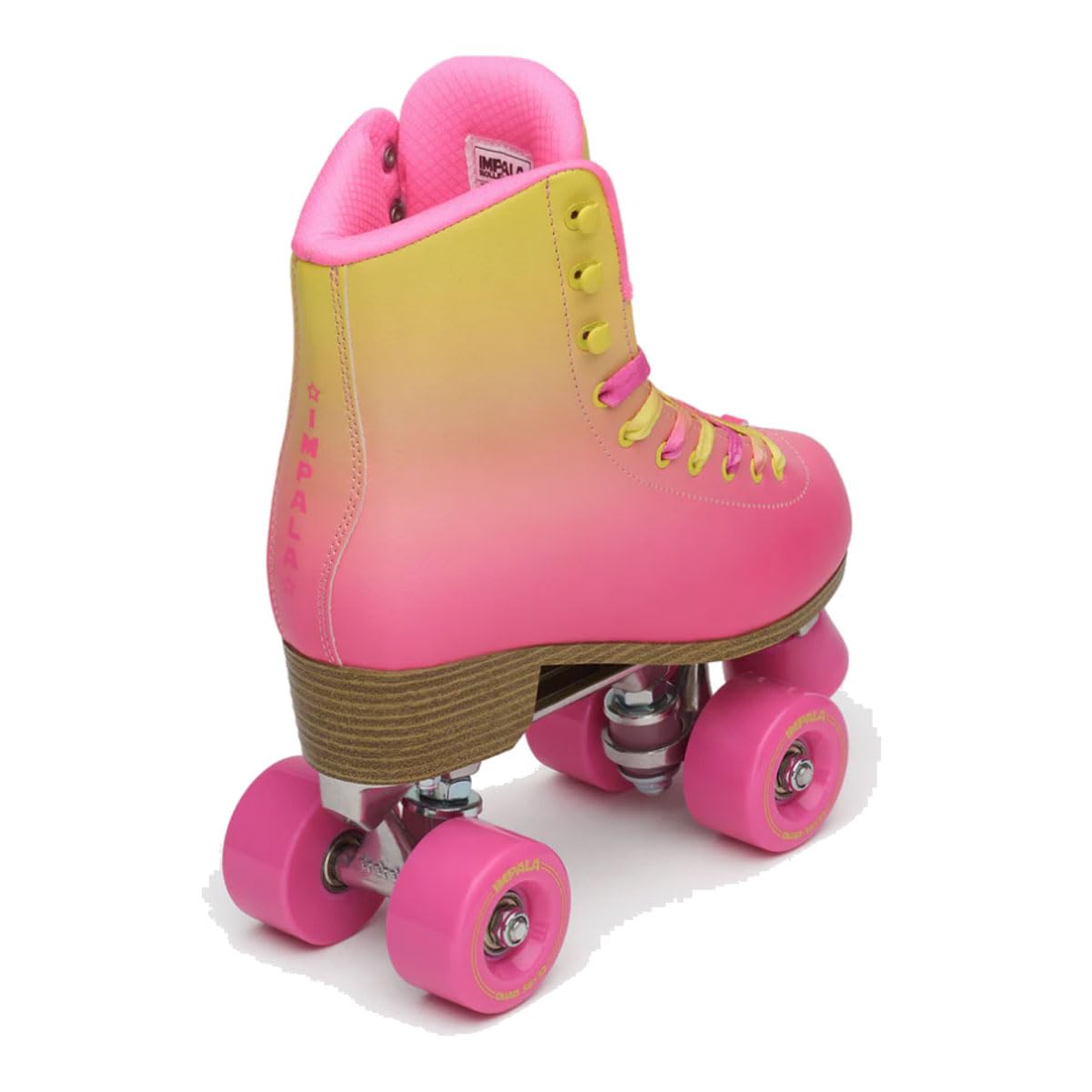 Bold pops of color and classic 70's style are reborn. Rock retro rink realness with the eye-catching Impala Rollerskates Impala Quad Skate. PETA-approved vegan product. PVC upper heel and sole. Metal speed lace eyelets. Aluminum alloy trucks and baseplate. 58mm 82A durometer nylon core urethane wheels. ABEC 7 bearings. PU brake stopper.