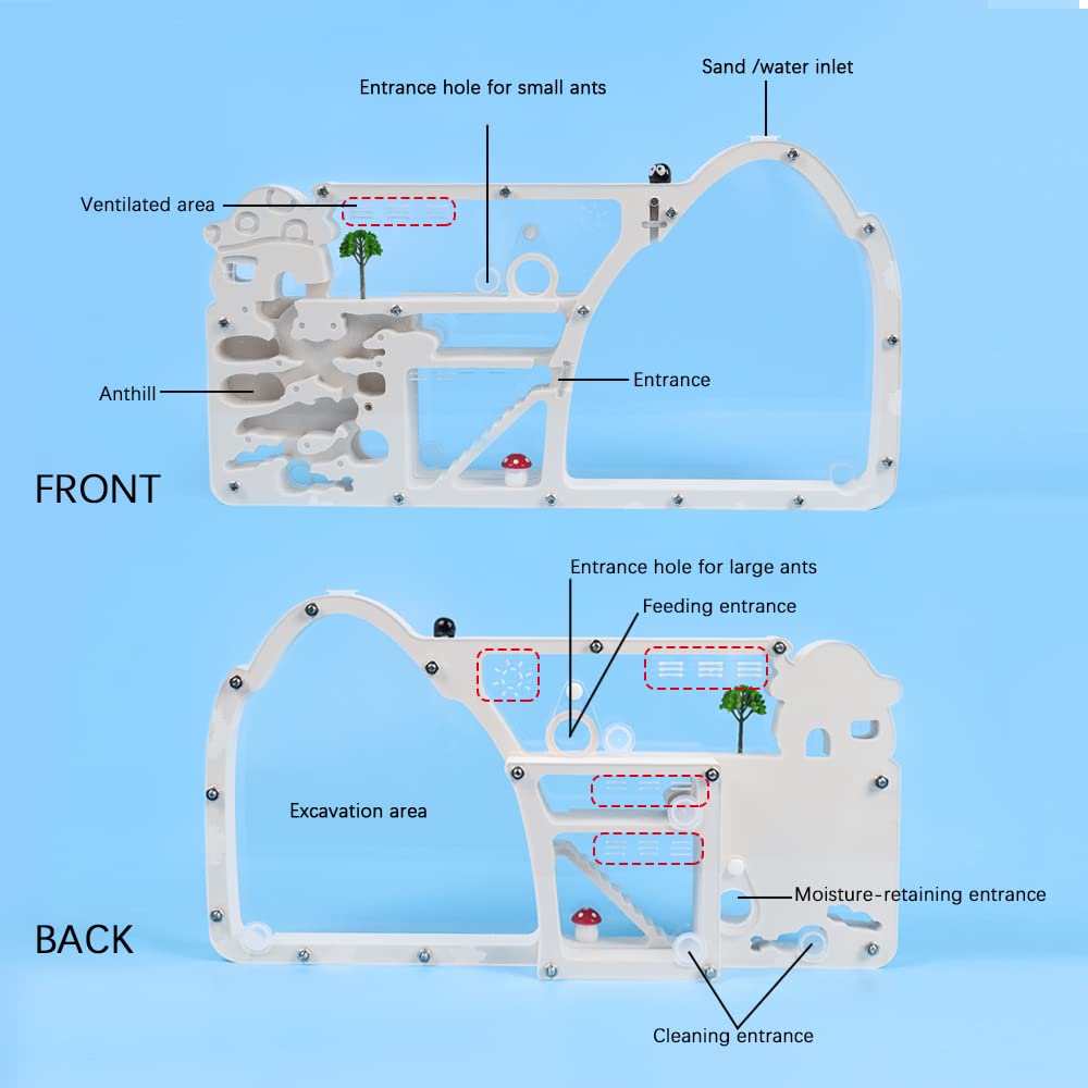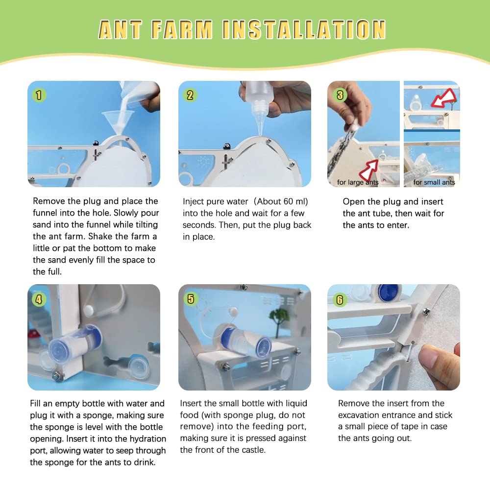 - Q: How does the automatic water supply system work? A: The automatic water supply system in the Ant Farm Castle allows you to easily keep your ant habitat moist. You can add water every 10 days through the refill hole, ensuring an optimal environment for your ants.