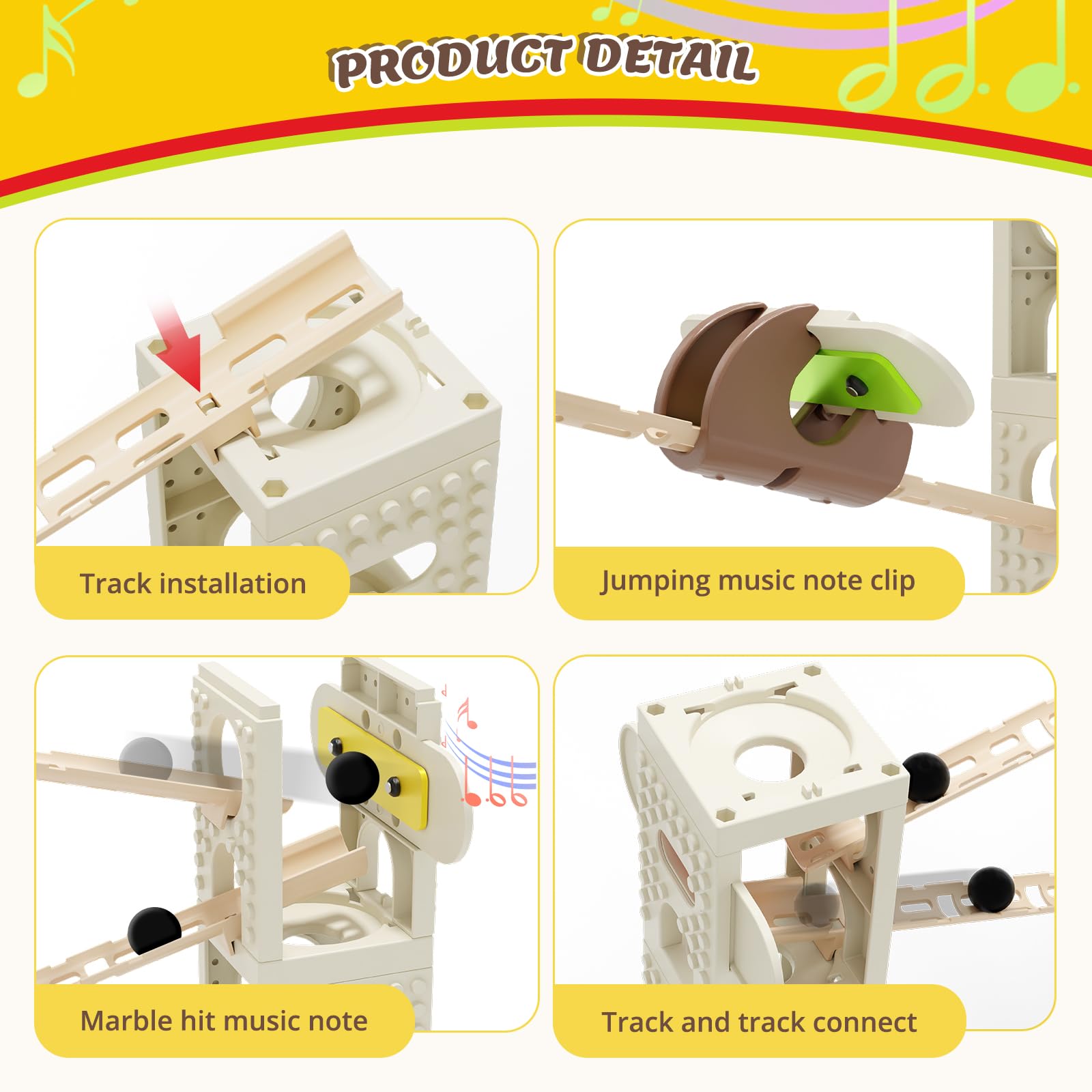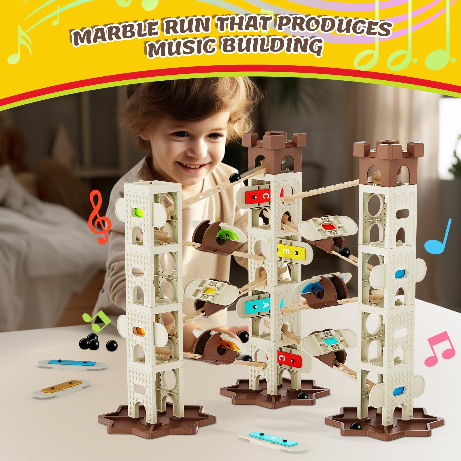 - Q: How does the music feature work in the marble run? A: The marble run includes a music module that plays different notes when marbles slide down the track and hit it. This feature enhances the play experience and attracts children's interest.