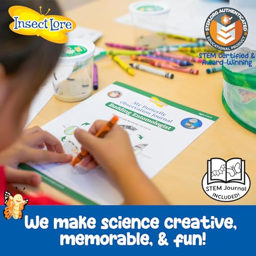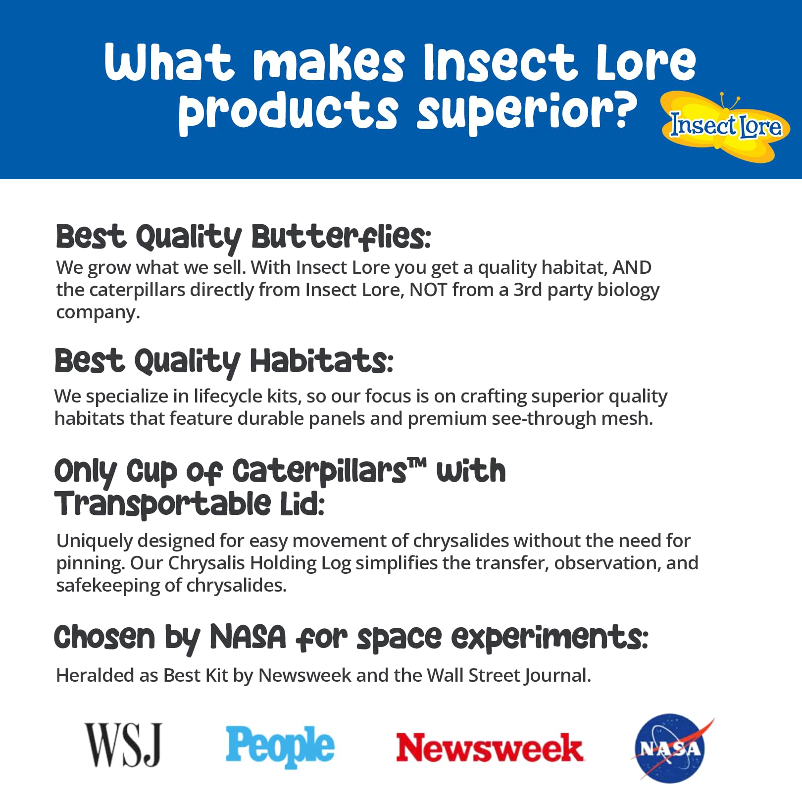 Unleash Wonder with Insect Lore's Butterfly Growing Kit:This unforgettable learning experience is sure to bring your family or classroom closer as you share the wonder of butterfly metamorphosis. Your live butterfly kit arrives with 10 baby caterpillars and everything you need to observe the fascinating Painted Lady butterfly life cycle. This 3-week project culminates in the release of your special pollinators into the outside world!Important Reminders:This order comes with live caterpillars. Our insects are sensitive to outdoor temperatures. Please ensure that daytime temperatures are above 50 degrees F when you release your butterflies. We cannot ship live insects to Mexico, Canada, Hawaii, Puerto Rico, APO, FPO or DPO addresses. Complex orders may arrive in fewer boxes. Always check your order immediately when you receive it.Your Butterfly Hatching Kit Includes: 10 baby caterpillars Caterpillar Food Reusable mesh habitat 2 Chrysalis Holding Logs Flower-shaped Butterfly Feeder Sugar Packets to make butterfly nectar Feeding Dropper STEM Butterfly Journal Butterfly Life Cycle Figurines Nature's Confetti Wildflower Seeds 3D Butterfly Sticker Pack Caterpillar Instruction GuideAbout Insect Lore:For over 50 years it has been Insect Lore's mission to provide children with the opportunity to see the incredible metamorphosis of a butterfly up close. Since then, Butterfly Garden, the world's first butterfly growing kit, has brought science, STEM learning, and joy to millions of families and school children.