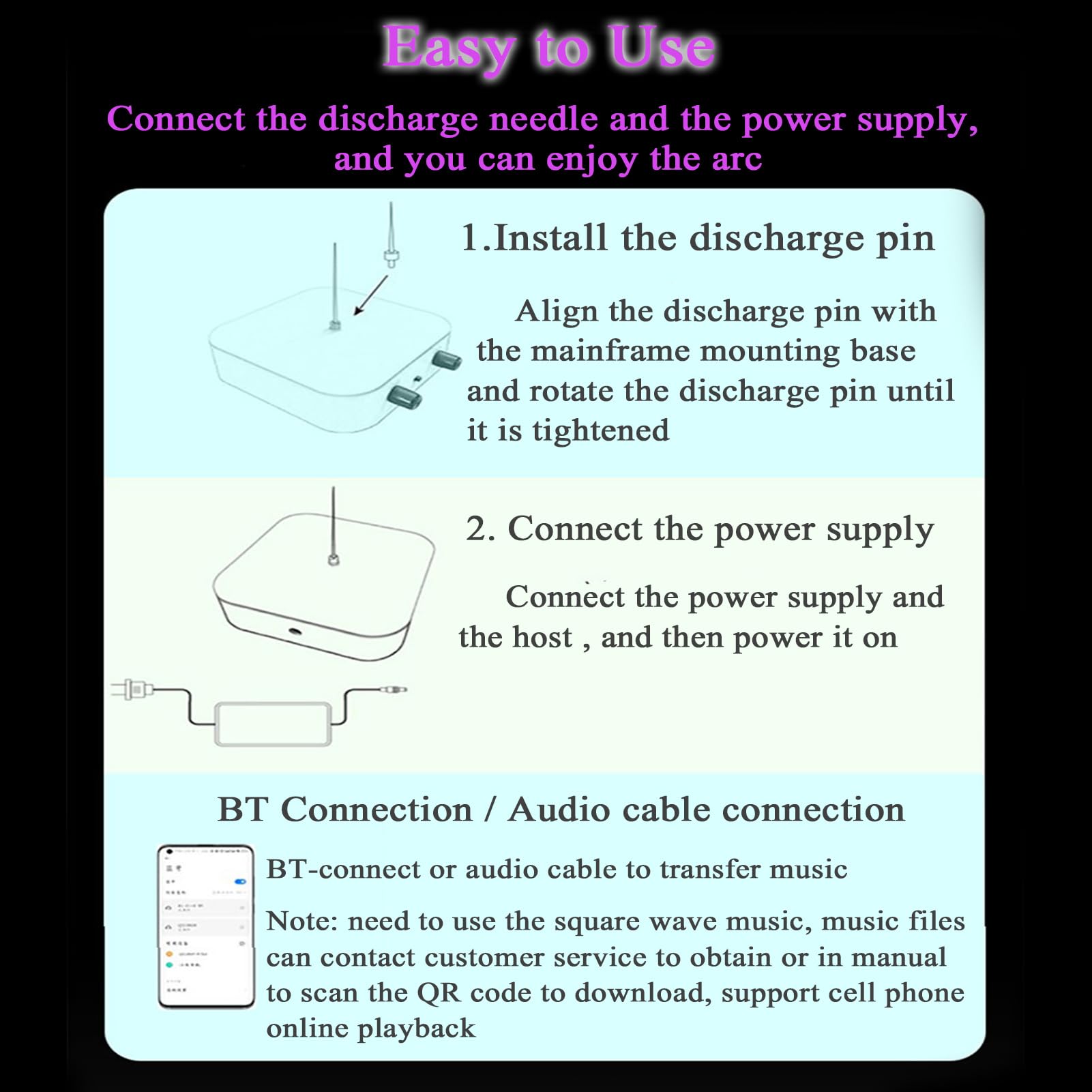 - Q: Can I use my own music with the Tesla Coil speaker? A: This Tesla Coil specifically plays square wave music, which is optimized for its functionality. You can obtain sonic music by scanning the QR code provided or contacting WOWNOVA for continuously updated music options.