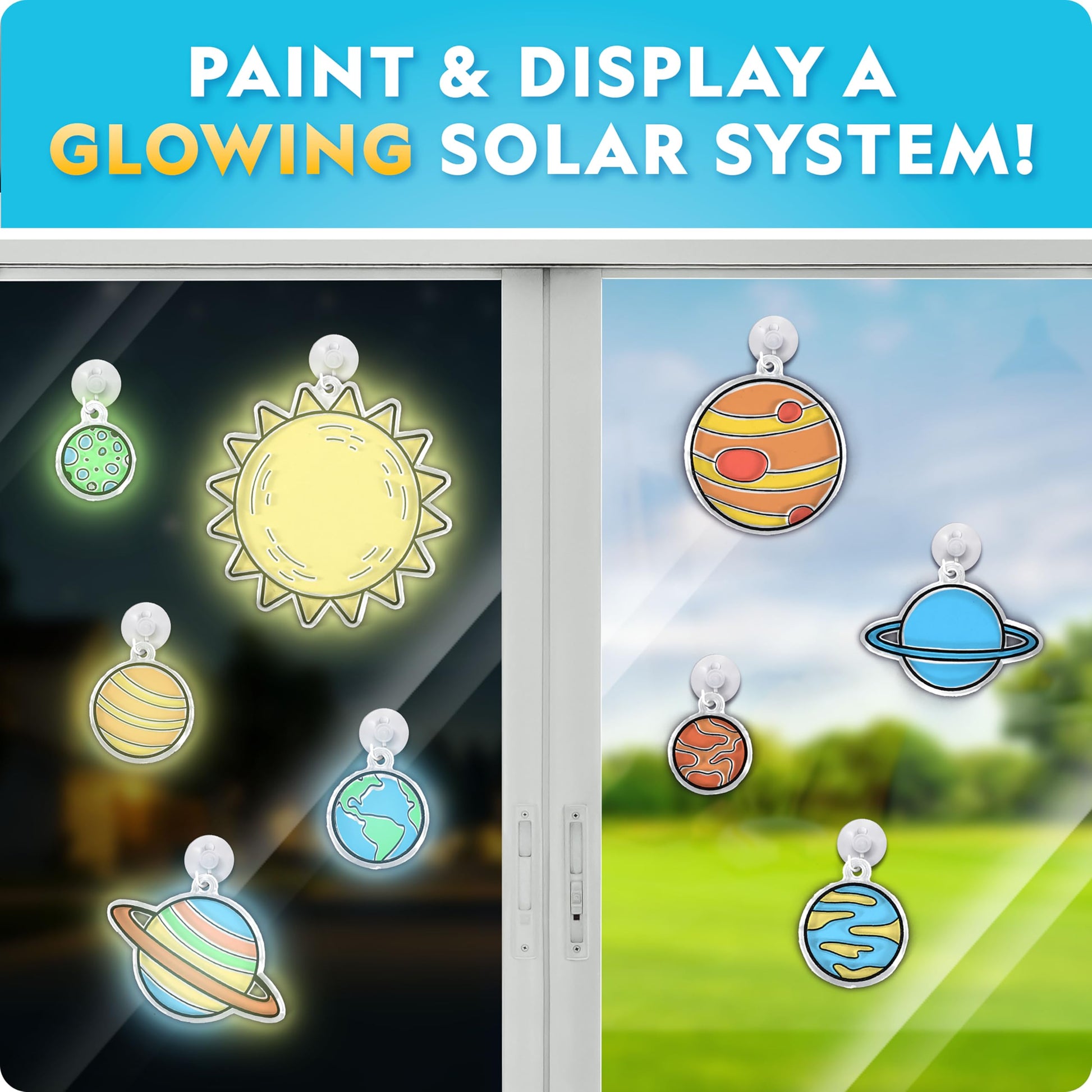 100+ PIECE SPACE ACTIVITY KIT - Discover the wonders of space with this all-in-one kit! Packed with over 100 pieces, kids can explore, create, and learn with dazzling crafts and hands-on science activities. | SEND A FOAM ROCKET SOARING - Kids will get hands-on with science as they launch a foam rocket into the sky! This thrilling experiment introduces kids to basic physics and inspires curiosity about space exploration. | CREATE GLOWING CONSTELLATIONS - Use the glow-in-the-dark stars and constellation cards to build and learn about constellations. Spark imagination and expand knowledge of the night sky while crafting these celestial designs. | PAINT & DISPLAY A GLOWING SOLAR SYSTEM - Paint and assemble a vibrant solar system that glows in the dark, then display it as window art with the included suction cups. It