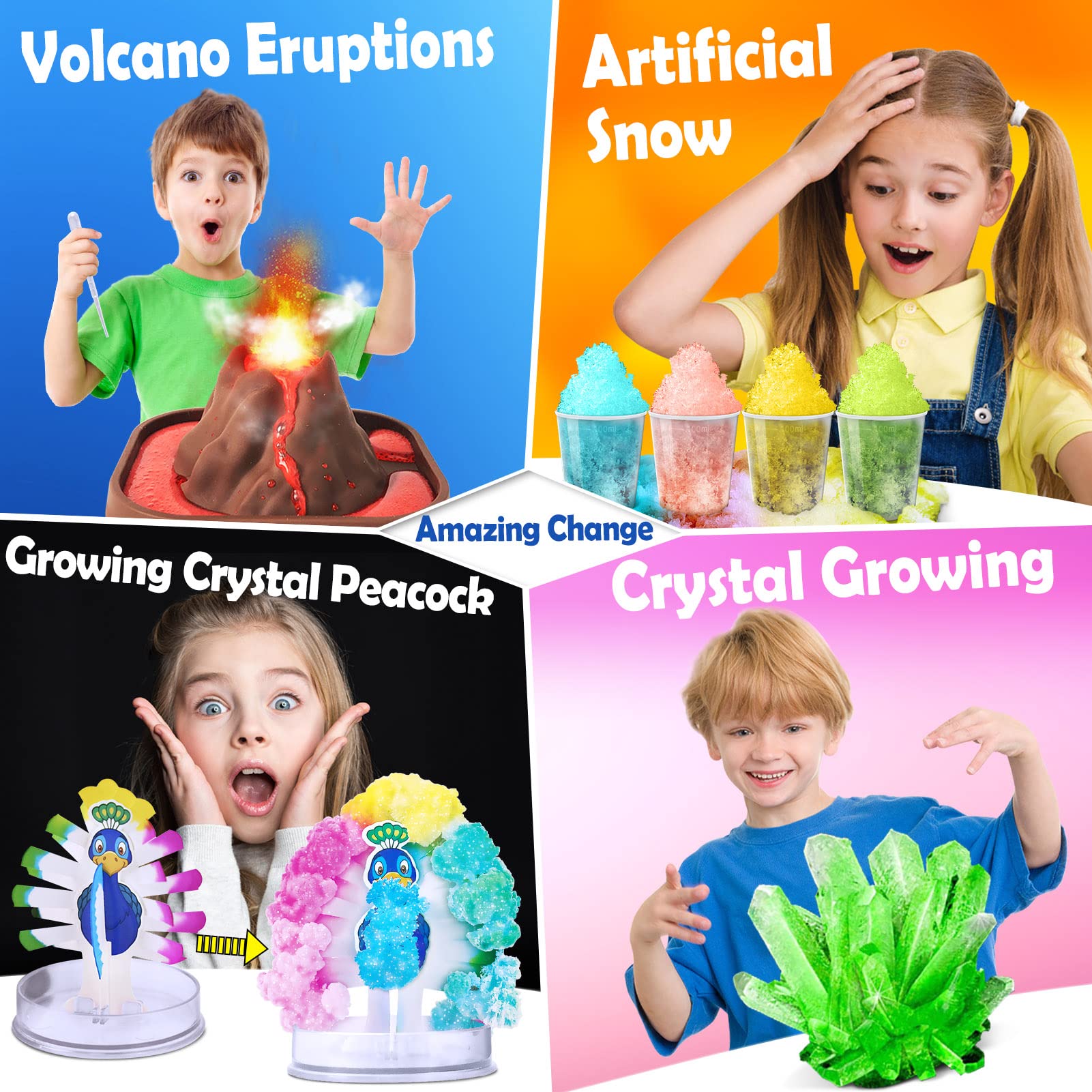 - Q: What types of experiments are included in the kit? A: This kit includes over 60 popular science experiments such as optical illusion tops, volcano eruptions, magic play sand, and rainbow rain, providing a wide range of engaging activities.
