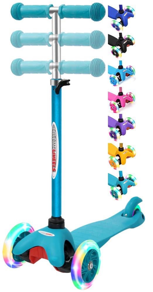 Chromewheels Scooter For Kids, Deluxe 3 Wheel Scooter For Toddlers 4 Adjustable Height Glider With Kick Scooters, Lean To Steer With Led Flashing Light For Ages 3-6 Girls Boys, Aqua