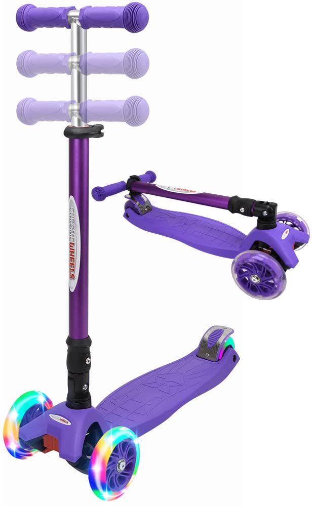 View compareChromewheels Scooters For Kids, Deluxe Kick Scooter Foldable 4 Adjustable Height 132Lbs Weight Limit 3 Wheel, Lean To Steer Led Light Up Wheels, Best Gifts For Girls Boys Age 3-12 Year Old, Purple
