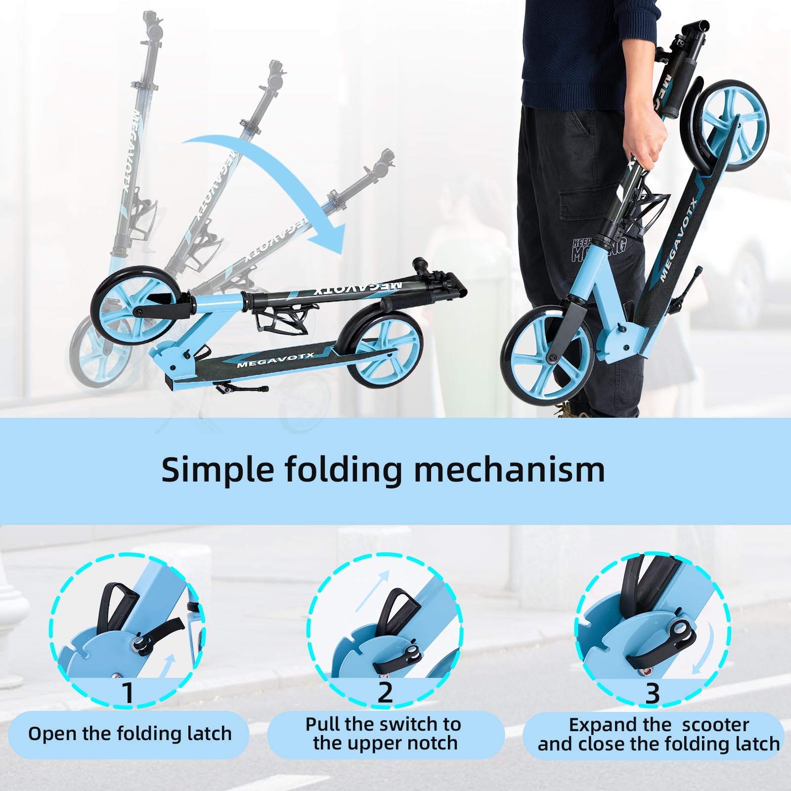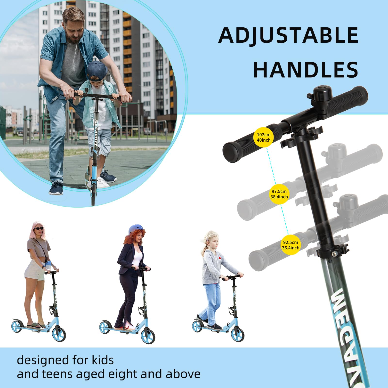 Megavotx Foldable Kids Scooter with 8 inch Sturdy Wheels - Scooters for Kids Teens mature-themeds Ages 8+ Adjustable Handlebar Gift for Boys&Girls 220lbs Max Load Capacity Bearing ABEC7 - (Blue)