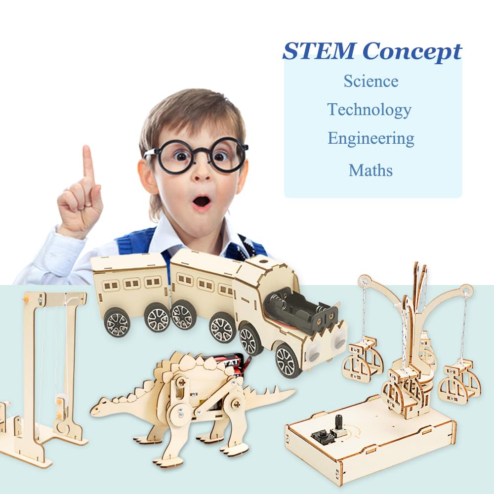 Features: STEM Toys Set:Our science kits for kids age 8-12 are handmade material kits for multiple toy models.We adhere to the concept of science, technology, engineering and math,so that children can experience the fun of DIY in the process of independently assembling each model toy, cultivating scientific interest,learning scientific knowledge, exercising children's thinking ability and innovation.It's worth choosing. Multi-type & Multi-scene:The STEM science experiment kits have a variety of different types and styles to choose from, including models of transportation such as ships, airplanes, cars, etc., as well as STEM recreational building toys such as windmill houses, ferris wheels, carousels, etc., and gears, scales, cranes to understand the knowledge of physics and different models of dinosaurs, to satisfy the child's needs for a wide range of interests.Both boys and girls will like.They can be used for many occasions. Safe Material Composition:These 3D wooden puzzles for kids are made of high quality natural wood as the main body of the model,which is green and environmentally friendly,safe and reliable,with high quality electronic parts,which are stable and reliable,as well as high quality plastic accessories,which are safe and environmentally friendly,odorless,which is the best learning toy kit for children. Detailed Instructions:Our toy kits come with high-definition complete color printing instructions and instructional video,easy for children to assemble the components independently according to the instructions and provide children with detailed knowledge explanation. Usage: These sets of STEM toys can be used as educational 3D cartoon puzzles for science and technology lessons, teaching children about science and physics while exercising their hands-on skills and creativity in the building process. Dinosaur modeling sets are popular with boys and provide lots of fun while learning about dinosaur history. STEM building toys for 8-12 years old boys can be used as novel and unique crafts to decorate the room, the star lights can be used for illumination, very practical.These toys can also be used as a beautiful gift for classmates and friends after assembling. Product Specifications: Material:Wooden Color:Original wood color, as shown in the picture Size:Approximately 8*6*2 inches Includes: The STEM toys set includes four different wooden puzzle model toy material kits,which are hand crank crane, balance scale, conveyor belt and gear drive model. Each model measures approximately 8*6*2 inches. Note: Manual measurement,please allow a slight error in size. There may be slight differences in color due to different screen displays.