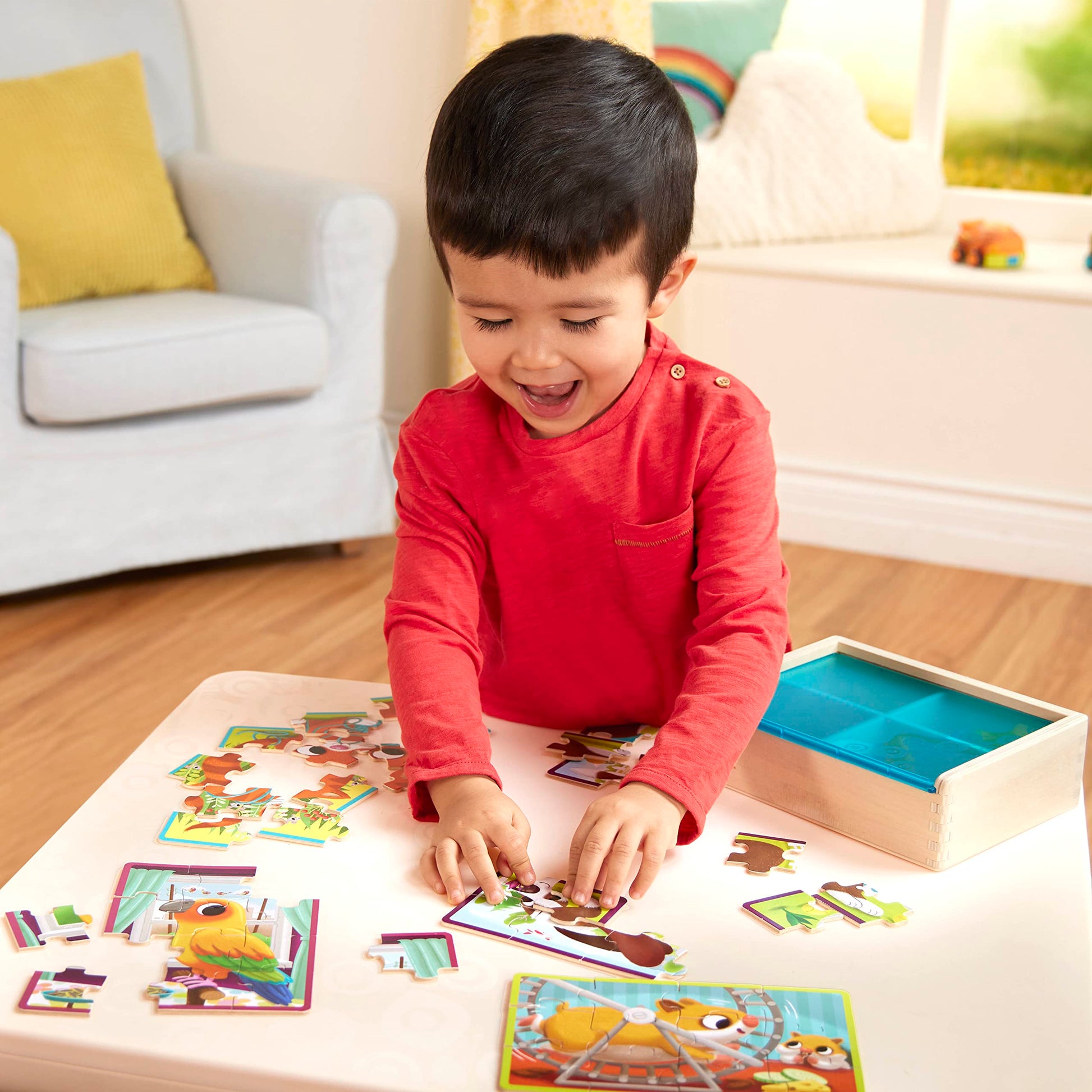 - Q: How can I store the puzzles when not in use? A: The B. toys Wooden Puzzle Set comes with a sturdy wooden box that allows for simple and organized storage of all the puzzles when they're not being played with.