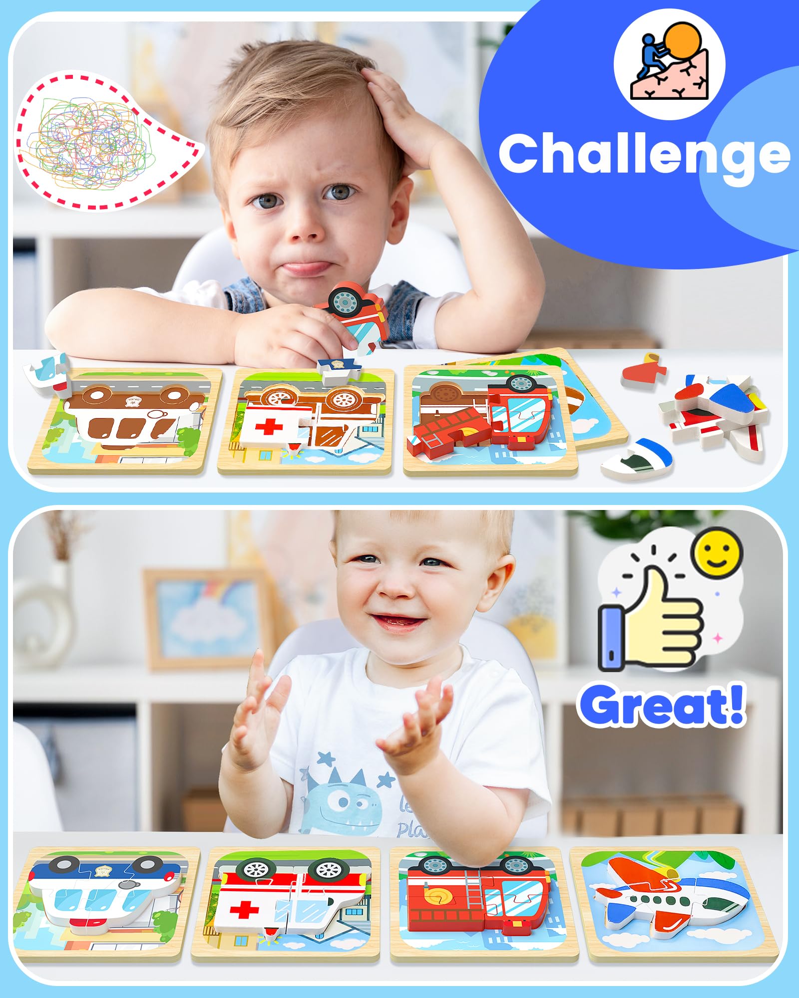 1. Various Patterns Toddler puzzles include 8 different vehicles in total. It's great learning resources for toddlers to identify different vehicles shapes, helpful for preschoolers to develop fine motor skills, hand-eye coordination, and discovery skills. 2. Enhance parent-child bonding Kids can learn to cooperate with each other and find solutions to problems by completing wooden puzzles with family and friends and can further foster relationships with their children in the process. 3. Safe Toddler Toys for 1 2 3-Year-Old Boys Montessori toys for 1 2 3 year old boy and girl are well made with nice bright colors, smooth surfaces and rounded edges, very easy for kids little hands to hold, and safe for toddlers.