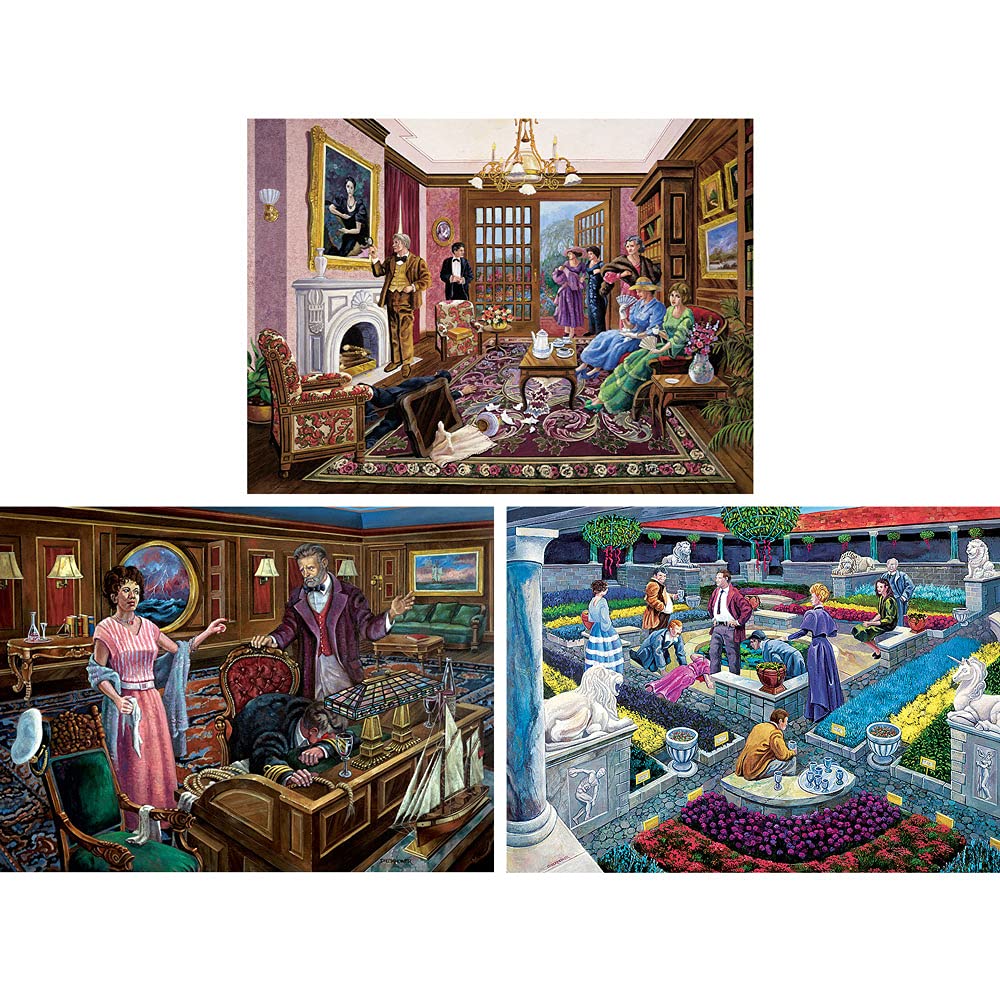 - Q: What is included in the 1000 Piece Jigsaw Puzzle set? A: Each set includes three 1000 piece jigsaw puzzles featuring unique designs: Murder at Bedford Manor, High Seas, and a Museum. Additionally, each puzzle comes with an 8” x 10” reference poster and story booklets to enhance your puzzling experience.