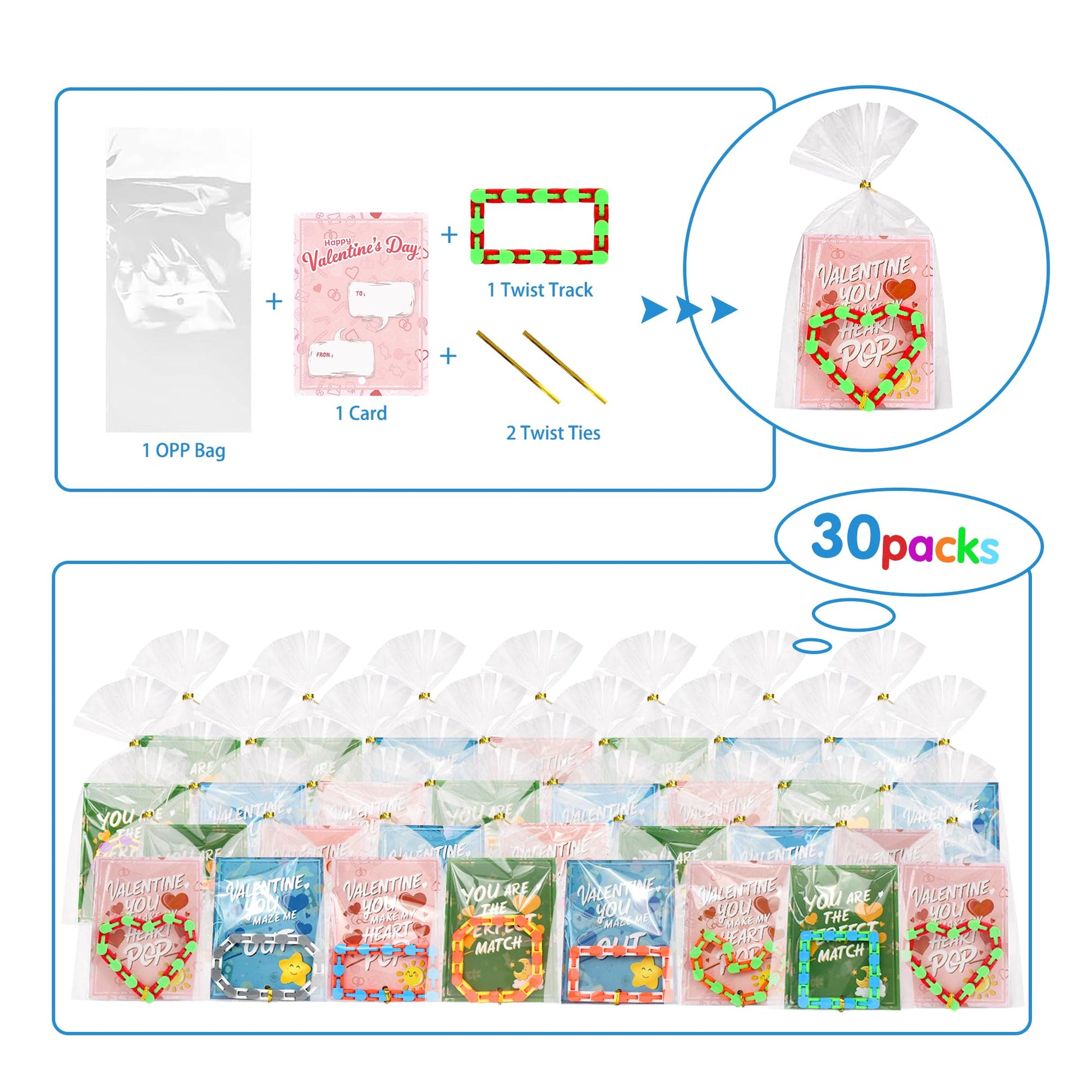 30 Pack Valentines Day Gifts For Kids-Wacky Tracks With Valentines Cards, Fidget Snake Puzzles Toys For Stress Relief, Valentines Day Cards For Kids Schools, Valentines Gift Exchange