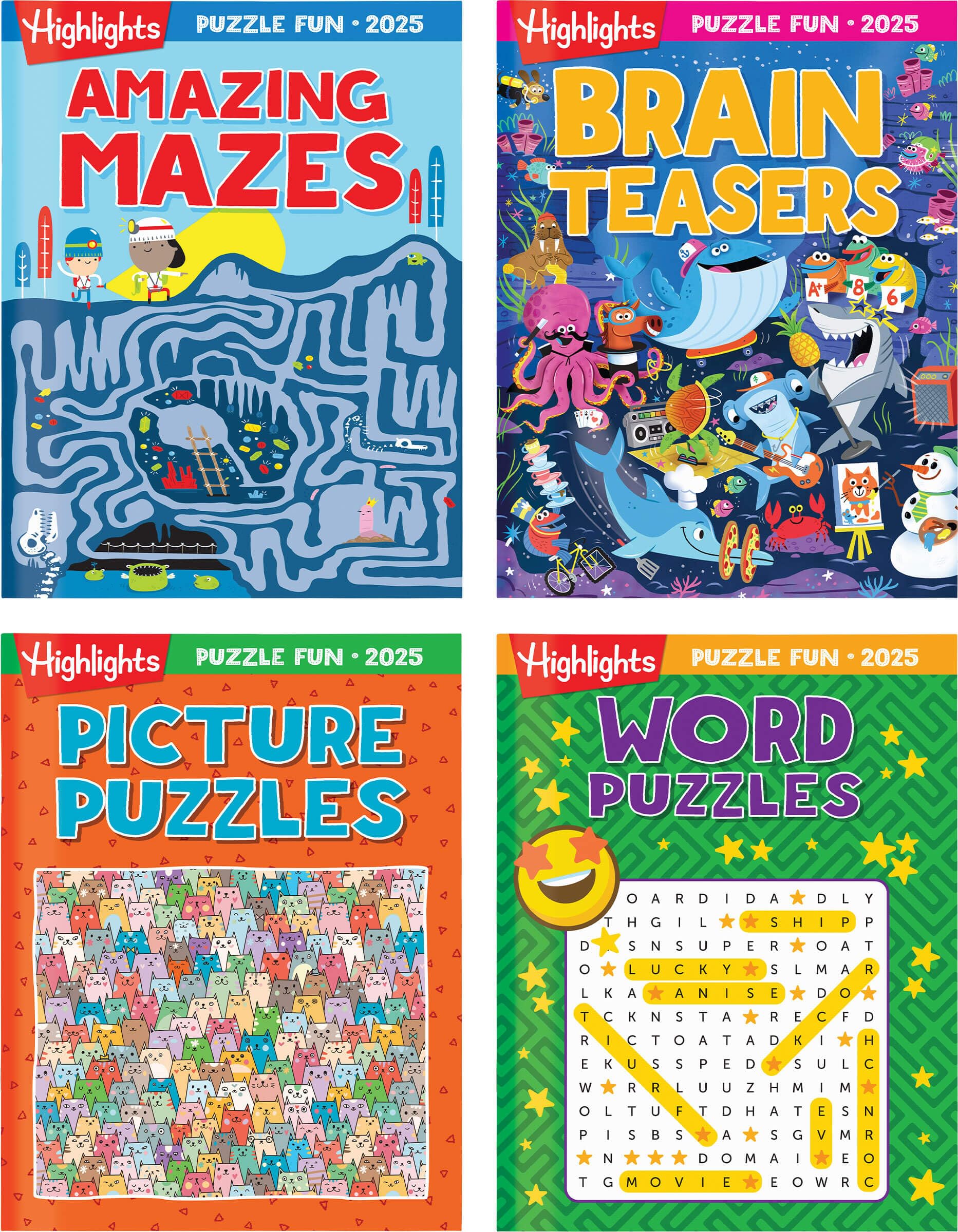 4 Books Of Puzzling Fun - If You Love Highlights Hidden Pictures Books, Try A New Challenge With The Puzzle Fun 4-Book Set; The All-New 2025 Collection Includes 4 Themed Puzzle Books, Each With 32 Pages And A Wide Variety Of Brain-Boosting, Screen-Free Activities Brain Teasers, Mazes & More - Picture Puzzles Includes Hidden Pictures Scenes, Find-The-Differences And More; The Activities In Brain Teasers Are Great For Sharpening Thinking Skills; Amazing Mazes Has Traditional Paths, String Paths And Other Twisty Fun; Word Puzzles Features Crosswords, Word Searches, Scrambles And Tongue-Twisters Build Skills Through Play - Highlights Puzzles Promote Attention To Detail, Get Kids Reading For Fun, And Improve Concentration, Persistence And Fine Motor Skills Bonus Activity Booklet - This Puzzle Fun Book Set Also Includes A Mini Book About Me; With Drawing Prompts, Engaging Questions And Over 100 Stickers Inside, This Journal-Style Booklet Encourages Kids To Express Themselves On Every Page And Creates A Keepsake Of Their Experiences For 2025 Fun With A Purpose - For Over 75 Years, Highlights Has Inspired Children To Become Curious, Creative, Caring And Confident Individuals; With Products That Encourage Thinking, Creativity And Self-Expression, Highlights Helps Kids Build Essential Skills, All While Having Fun