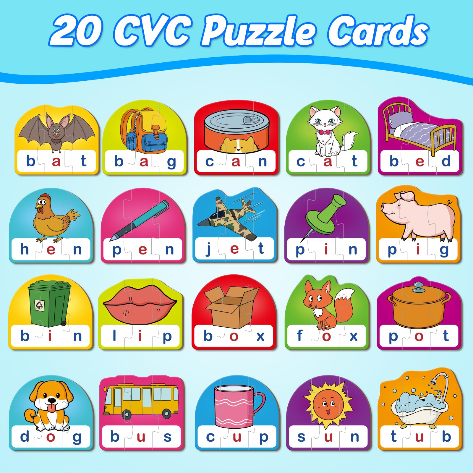 - Q: How do the CVC Puzzle Cards help with learning phonics? A: The CVC Puzzle Cards help children learn phonics by allowing them to assemble three-piece puzzles that represent CVC (consonant-vowel-consonant) words. The color-coded pieces differentiate vowels and consonants, enhancing phonemic awareness and spelling skills.