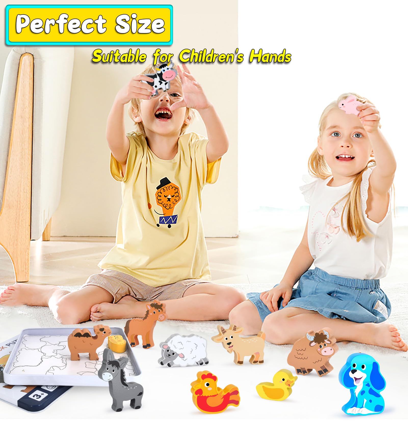 KECIABO Wooden Animal Puzzles Toys for Toddlers,12 Pcs Farm Animal Figures,Animal Matching Sorting Stacking Toys for Boys Child