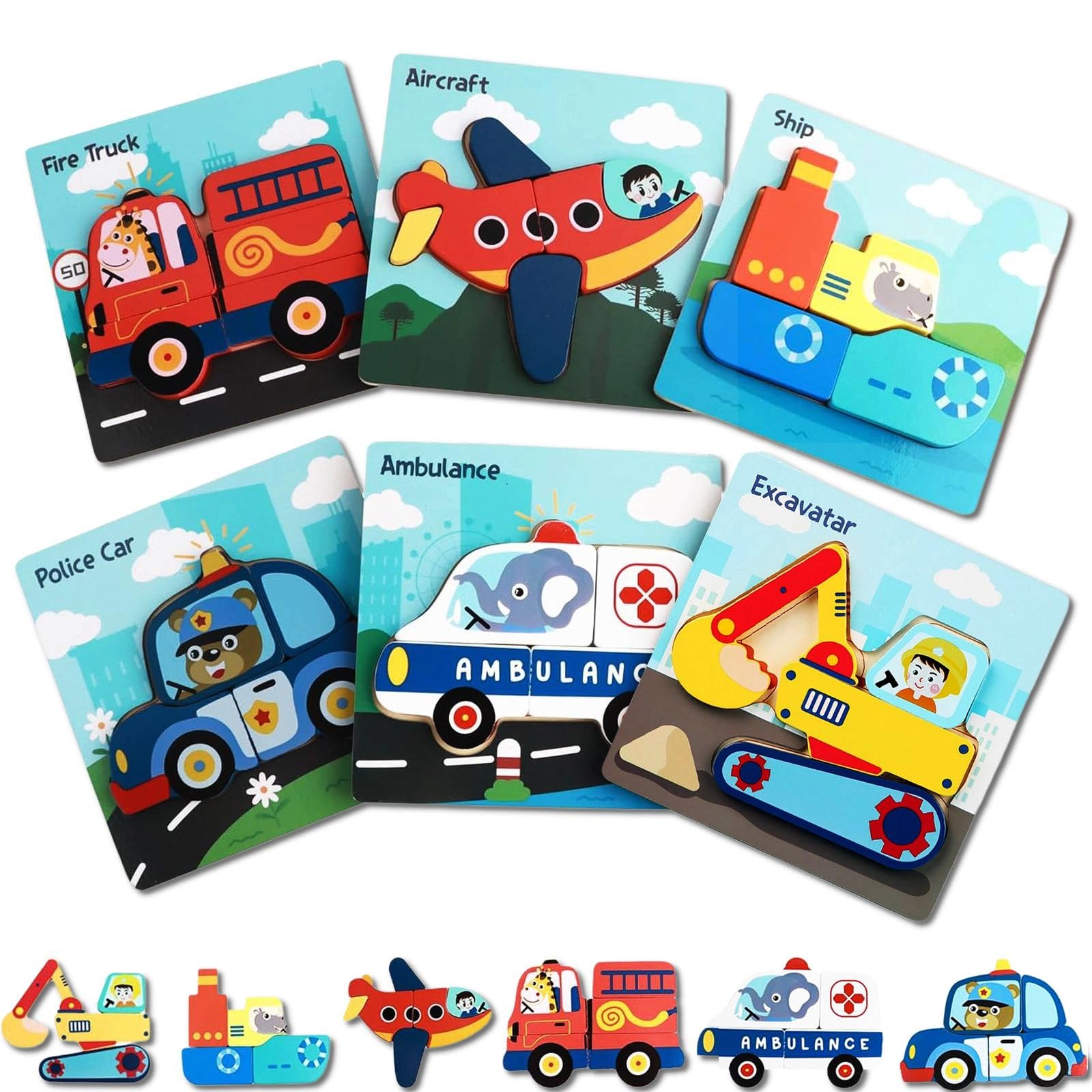 Merrypony Wooden Puzzles For Toddlers 1-3, 6 Pcs Puzzles For Toddlers 2-4, Vehicle Shape Montessori Puzzles For 1 Year Old, Wood